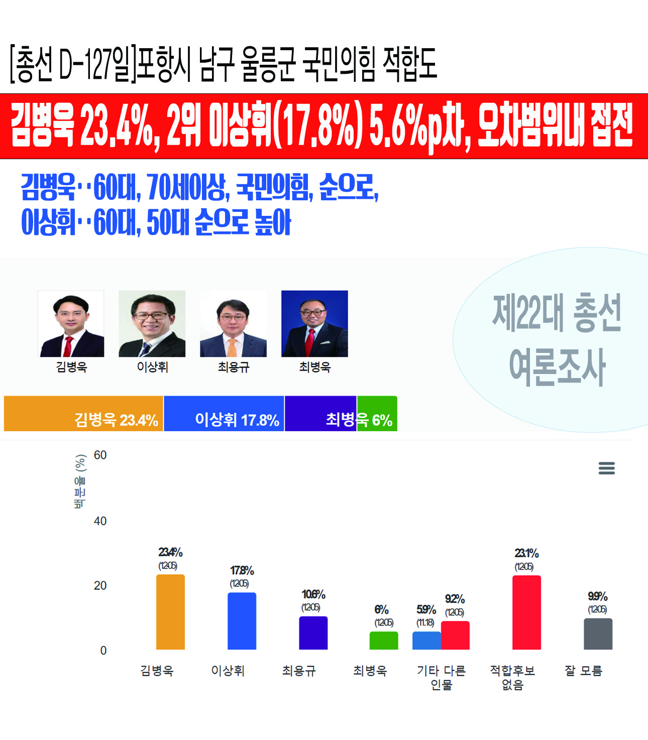 ³»³â Á¦22´ë ±¹È¸ÀÇ¿ø ¼±°Å¸¦ 127ÀÏ ¾ÕµÎ°í Á¶»çµÈ Æ÷Ç׽à ³²±¸ ¿ï¸ª±º ¼±°Å±¸ ¡¸±¹¹ÎÀÇÈû Èĺ¸ ÀûÇÕµµ¡¹¿©·ÐÁ¶»ç¿¡¼­ ±èº´¿í Çö ±¹È¸ÀÇ¿øÀÌ 23.4%¸¦ ¾ò¾î 'ÀÌ»óÈÖ'(17.8%) Èĺ¸¿Í 5.6%p Â÷ÀÌ·Î ¿ÀÂ÷¹üÀ§³» Á¢ÀüÀ» ¹úÀÌ´Â °ÍÀ¸·Î ³ªÅ¸³µ´Ù.