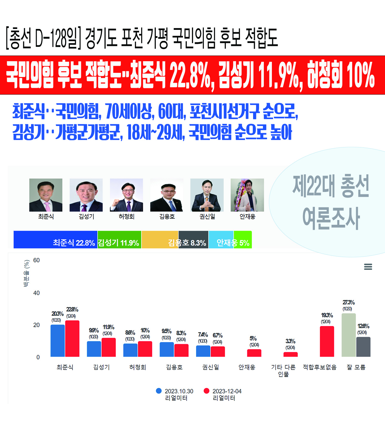 [ÃѼ± D-128ÀÏ] °æ±âµµ Æ÷õ °¡Æò ±¹¹ÎÀÇÈû Èĺ¸ ÀûÇÕµµ¡¥ÃÖÁØ½Ä 22.8%, ±è¼º±â 11.9%, Çãûȸ 10%
