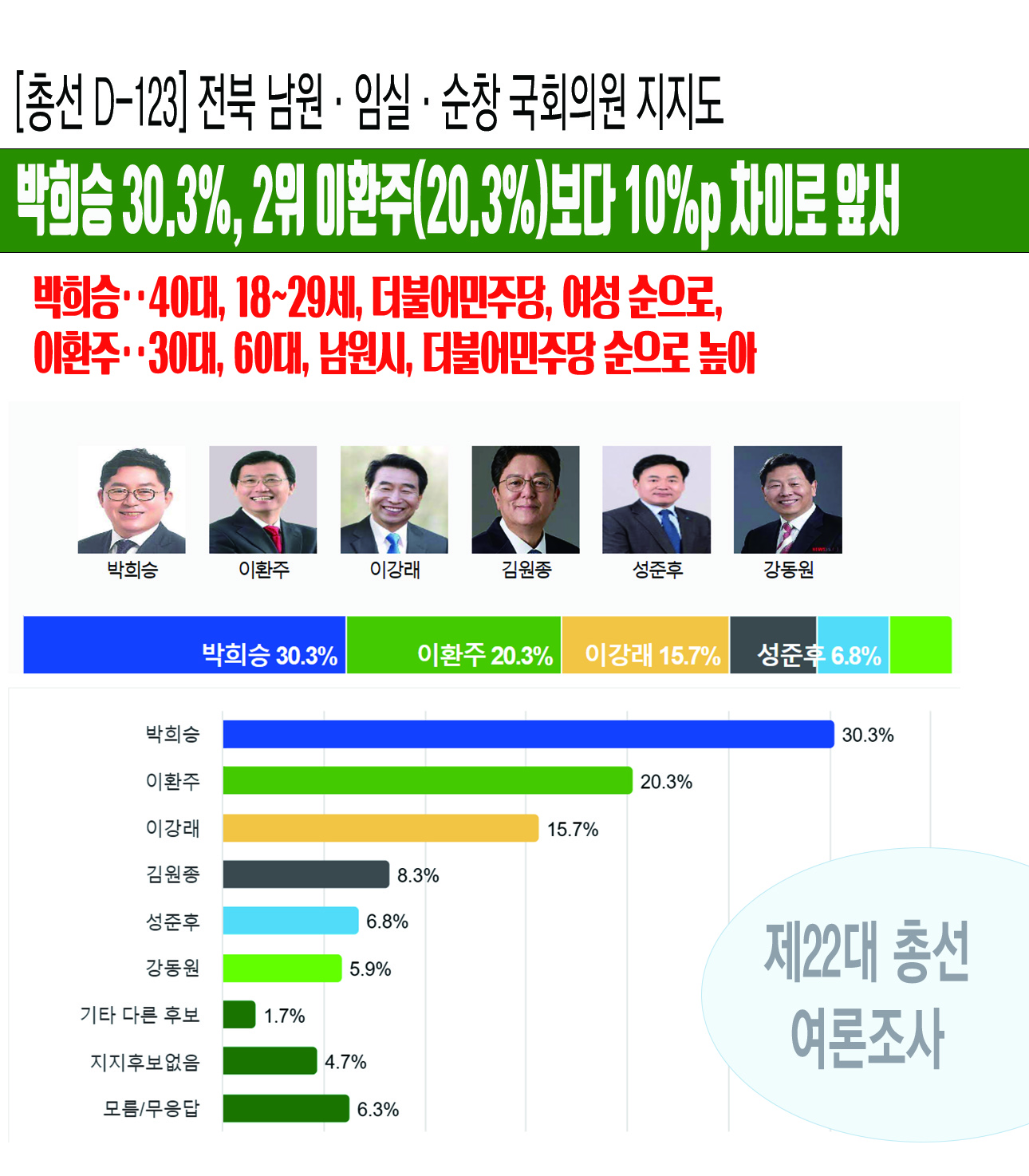 [ÃѼ± D-123] ÀüºÏ ³²¿ø¡¤Àӽǡ¤¼øÃ¢ ±¹È¸ÀÇ¿ø¡¤¡¤¡¤¹ÚÈñ½Â 30.3%, 2À§ ÀÌȯÁÖ(20.3%)º¸´Ù 10%p Â÷ÀÌ·Î ¾Õ¼