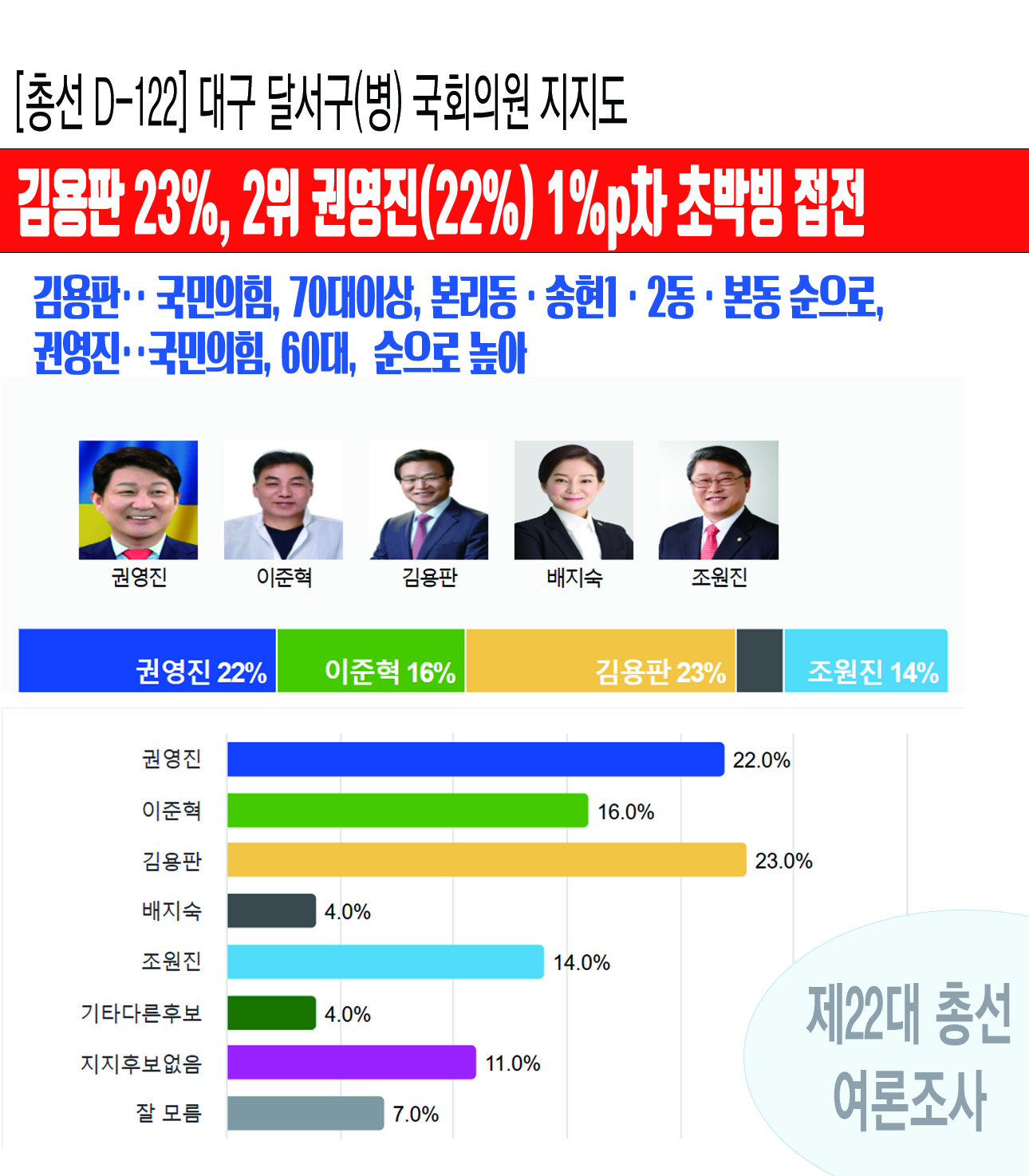 ³»³â Á¦22´ë ±¹È¸ÀÇ¿ø ¼±°Å¸¦ 122ÀÏ ¾ÕµÎ°í Á¶»çµÈ ´ë±¸±¤¿ª½Ã ´Þ¼±¸ º´ ¼±°Å±¸ ¡¸´Þ¼±¸º´ ±¹È¸ÀÇ¿ø Èĺ¸ÀûÇÕµµ¡¹¿©·ÐÁ¶»ç¿¡¼ ±è¿ëÆÇ Çö ±¹È¸ÀÇ¿øÀÌ 23%¸¦ ¾ò¾î 22%¸¦ ¾òÀº ±Ç¿µÁø Àü ´ë±¸½ÃÀå¿Í 1%p Â÷ÀÌ·Î ÃÊ ¹ÚºùÀÇ Á¢ÀüÀ» ¹úÀÌ´Â °ÍÀ¸·Î ³ªÅ¸³µ´Ù.