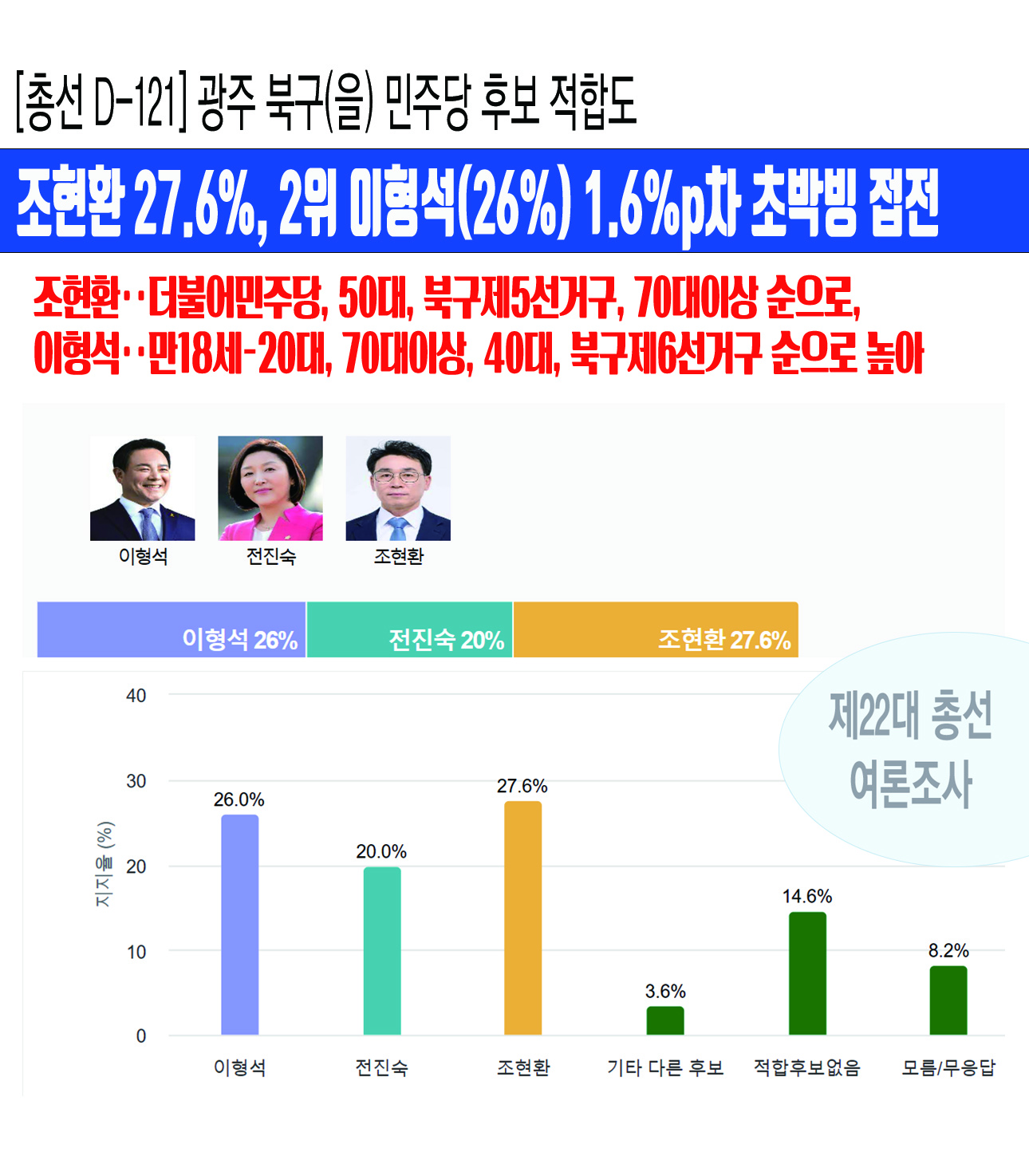 ³»³â Á¦22´ë ±¹È¸ÀÇ¿ø ¼±°Å¸¦ 121ÀÏ ¾ÕµÎ°í Á¶»çµÈ ±¤ÁÖ±¤¿ª½Ã ¡¸ºÏ±¸(À») ´õºÒ¾î¹ÎÁÖ´ç Èĺ¸ ÀûÇÕµµ¡¹¿©·ÐÁ¶»ç¿¡¼­ Á¶Çöȯ Àü ÀÌÀç¸í ´ë¼±Èĺ¸ Á¶Á÷Ưº¸´Ü ºÎ´ÜÀåÀÌ 27.6%¸¦ ¾ò¾î 26%¸¦ ¾òÀº ÀÌÇü¼® Çö ±¹È¸ÀÇ¿ø¿Í 1.6%p Â÷ÀÌ·Î ÃÊ ¹ÚºùÀÇ Á¢ÀüÀ» ¹úÀÌ´Â °ÍÀ¸·Î ³ªÅ¸³µ´Ù.