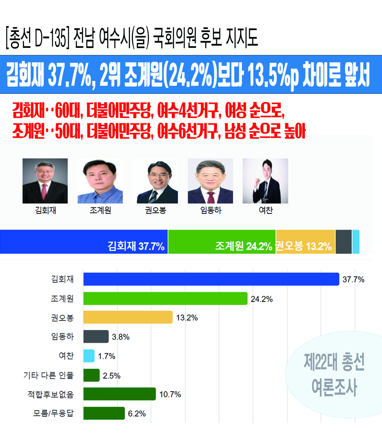 [ÃѼ± D-135] Àü³² ¿©¼ö½Ã(À») ±¹È¸ÀÇ¿ø¡¤¡¤¡¤±èȸÀç 37.7%, 2À§ Á¶°è¿ø(24.2%)º¸´Ù 13.5%p Â÷ÀÌ·Î ¾Õ¼­