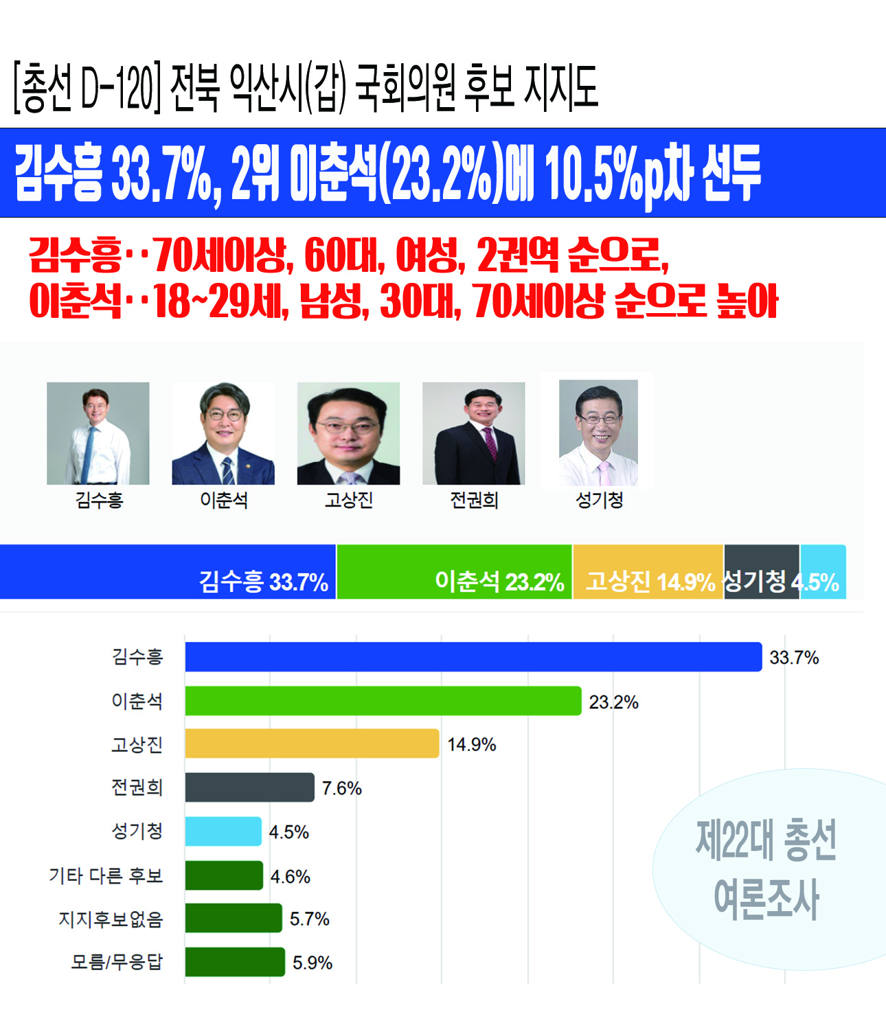 [ÃѼ± D-120] ÀüºÏ ÀÍ»ê½Ã(°©) ±¹È¸ÀÇ¿ø¡¤¡¤¡¤±è¼öÈï 33.7%, 2À§ ÀÌÃá¼®(23.2%)¿¡ 10.5%pÂ÷ ¼±µÎ