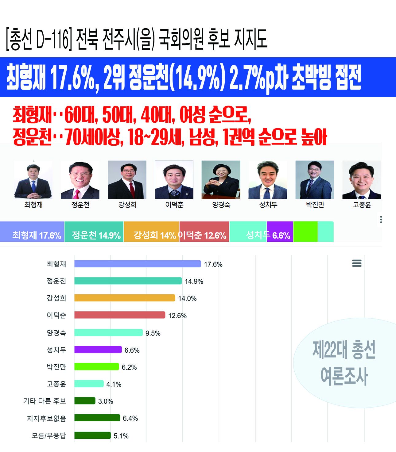 [ÃѼ± D-116] ÀüºÏ ÀüÁÖ½Ã(À») ±¹È¸ÀÇ¿ø¡¤¡¤¡¤ÃÖÇüÀç 17.6%, 2À§ Á¤¿îõ(14.9%) 2.7%pÂ÷ Ãʹںù Á¢Àü