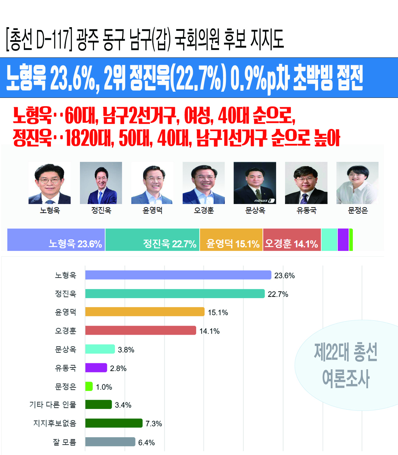 [ÃѼ± D-117] ±¤ÁÖ µ¿±¸ ³²±¸(°©) ±¹È¸ÀÇ¿ø¡¤¡¤¡¤³ëÇü¿í 23.6%, 2À§ Á¤Áø¿í(22.7%) 0.9%pÂ÷ Ãʹںù Á¢Àü