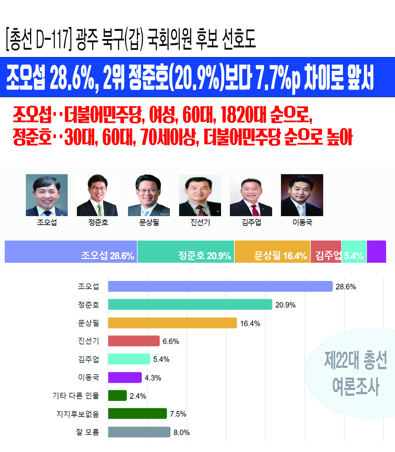 [ÃѼ± D-117] ±¤ÁÖ ºÏ±¸(°©) ±¹È¸ÀÇ¿ø¡¤¡¤¡¤Á¶¿À¼· 28.6%, 2À§ Á¤ÁØÈ£(20.9%)º¸´Ù 7.7%p Â÷ÀÌ·Î ¾Õ¼