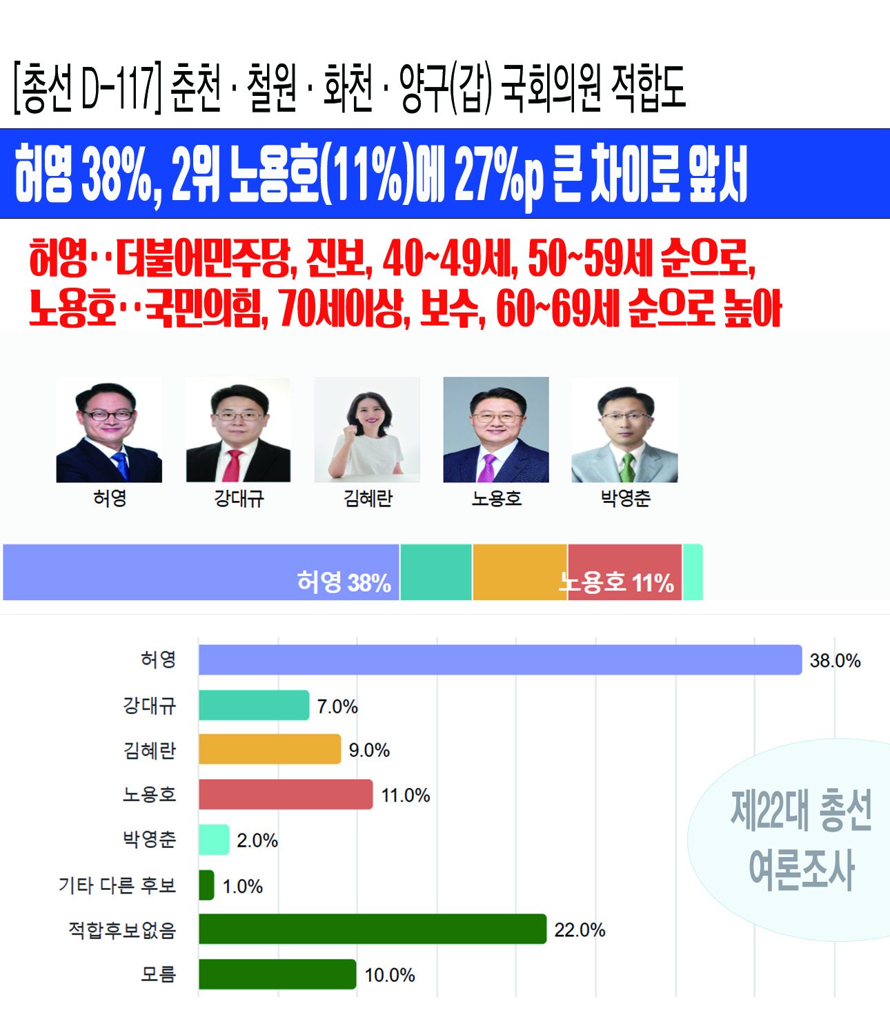 ³»³â Á¦22´ë ±¹È¸ÀÇ¿ø ¼±°Å¸¦ 117ÀÏ ¾ÕµÎ°í Á¶»çµÈ °­¿øÆ¯º°ÀÚÄ¡µµ Ãáõ½Ãö¿ø±ºÈ­Ãµ±º¾ç±¸±º °© ¼±°Å±¸ ¡¸±¹È¸ÀÇ¿ø Èĺ¸ÀûÇÕµµ¡¹¿©·ÐÁ¶»ç¿¡¼­ Ç㿵 Çö Ãáõ ö¿ø ȭõ ¾ç±¸°© ±¹È¸ÀÇ¿øÀÌ 38%¸¦ ¾ò¾î 11%¸¦ ¾òÀº ³ë¿ëÈ£ Çö ºñ·Ê´ëÇ¥ ±¹È¸ÀÇ¿ø¸¦ 27%pÀÇ Å« Â÷ÀÌ·Î ¾Õ¼­ ³ª°¡´Â °ÍÀ¸·Î ³ª¿Ô´Ù.