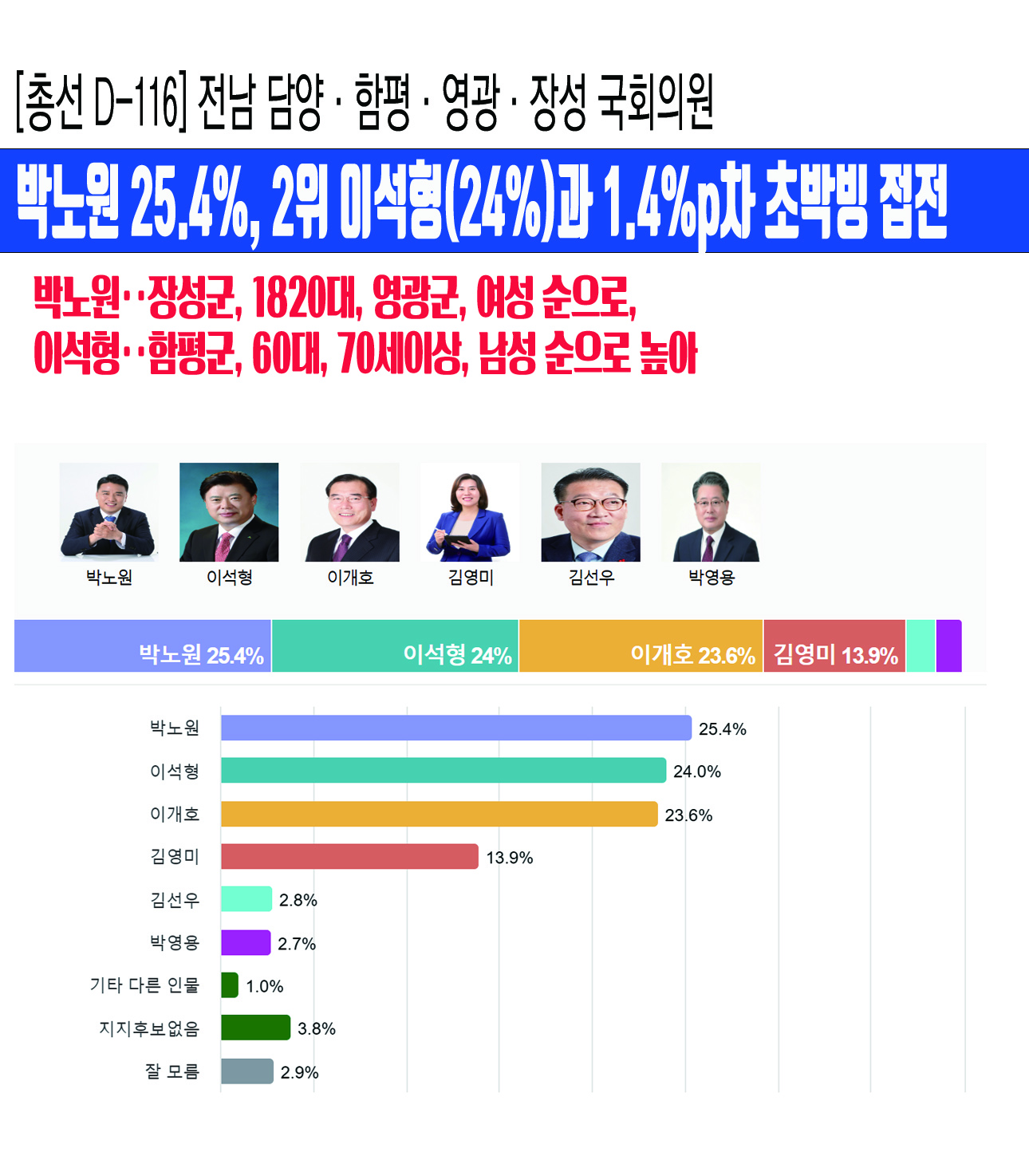 [ÃѼ± D-116] Àü³² ´ã¾ç¡¤ÇÔÆò¡¤¿µ±¤¡¤À强 ±¹È¸ÀÇ¿ø¡¤¡¤¡¤¹Ú³ë¿ø 25.4%, 2À§ À̼®Çü(24%)°ú 1.4%pÂ÷ Ãʹںù Á¢Àü