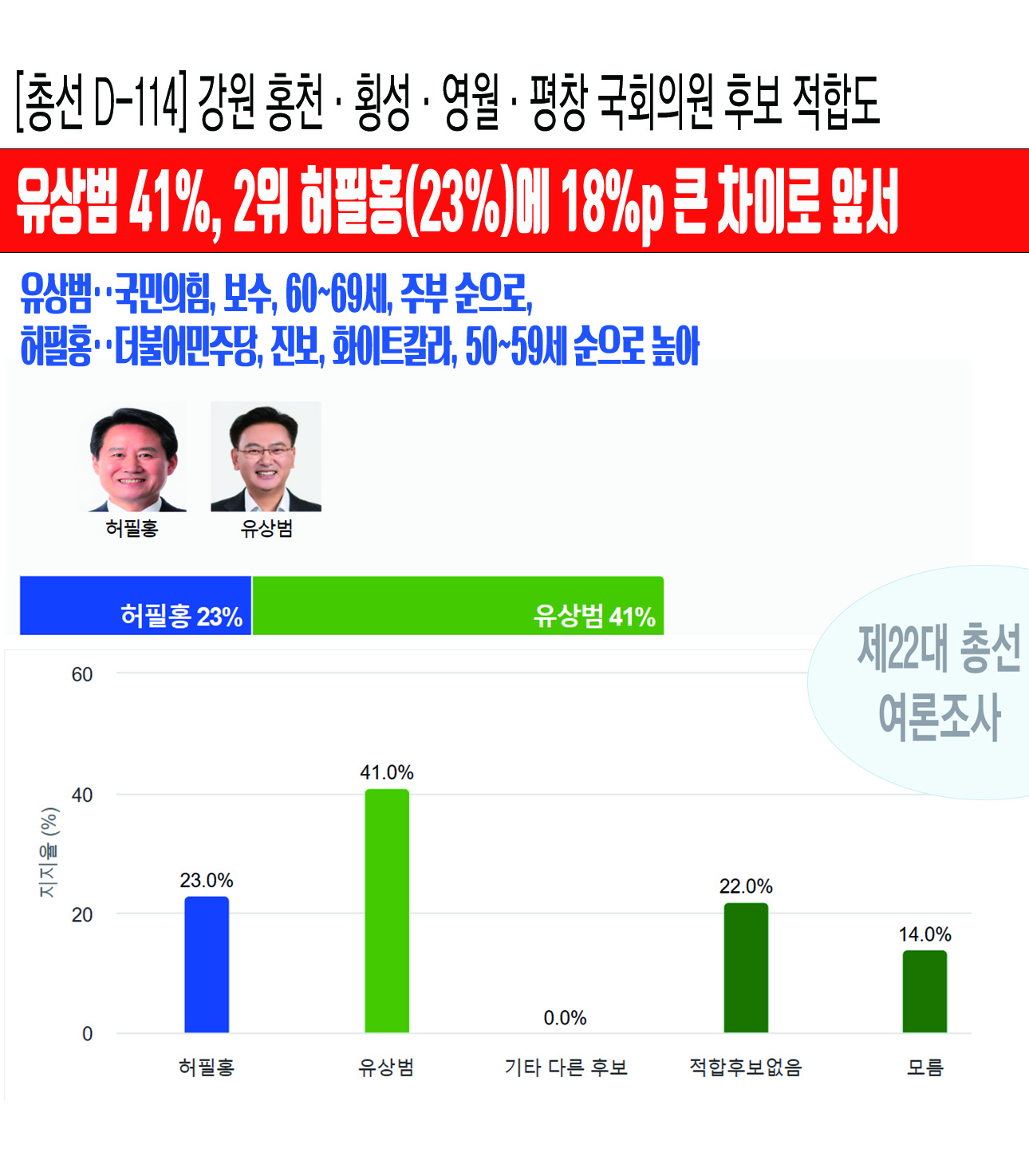 [ÃѼ± D-114] °­¿ø ȫõ¡¤È¾¼º¡¤¿µ¿ù¡¤Æòâ ±¹È¸ÀÇ¿ø¡¤¡¤¡¤À¯»ó¹ü 41%, 2À§ ÇãÇÊÈ«(23%)¿¡ 18%p Å« Â÷ÀÌ·Î ¾Õ¼­