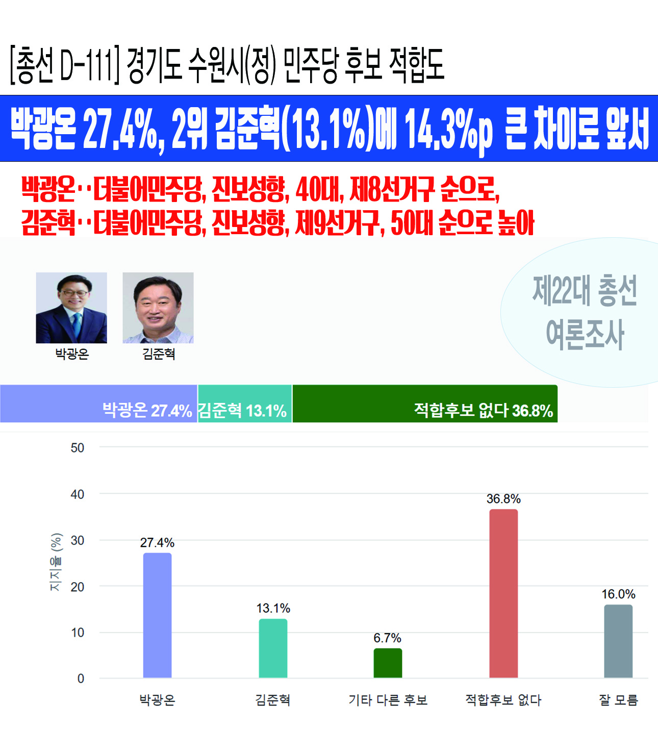 [ÃѼ± D-111] °æ±âµµ ¼ö¿ø½Ã(Á¤) ¹ÎÁÖ´ç Èĺ¸ ÀûÇÕµµ¡¤¡¤¡¤¹Ú±¤¿Â 27.4%, 2À§ ±èÁØÇõ(13.1%)¿¡ 14.3%p Å« Â÷ÀÌ·Î ¾Õ¼