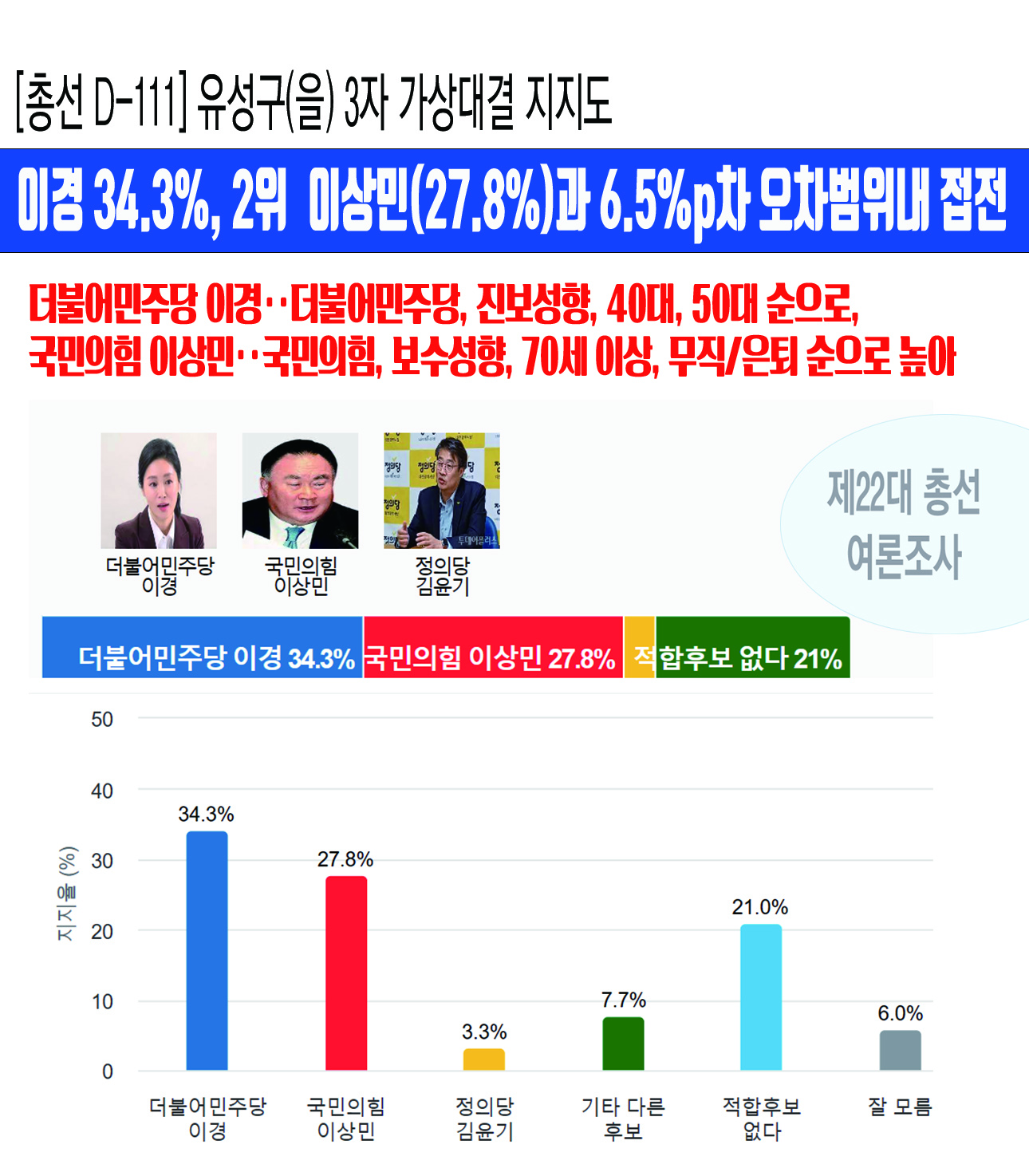 ³»³â Á¦22´ë ±¹È¸ÀÇ¿ø ¼±°Å¸¦ 111ÀÏ ¾ÕµÎ°í Á¶»çµÈ ´ëÀü±¤¿ª½Ã À¯¼º±¸ À» ¼±°Å±¸ ¡¸3ÀÚ °¡»ó´ë°á ÁöÁöµµ¡¹¿©·ÐÁ¶»ç¿¡¼ '´õºÒ¾î¹ÎÁÖ´ç À̰æ' È帰¡ 34.3%, '±¹¹ÎÀÇÈû ÀÌ»ó¹Î' È帰¡ 27.8%·Î ³ªÅ¸³µ´Ù.