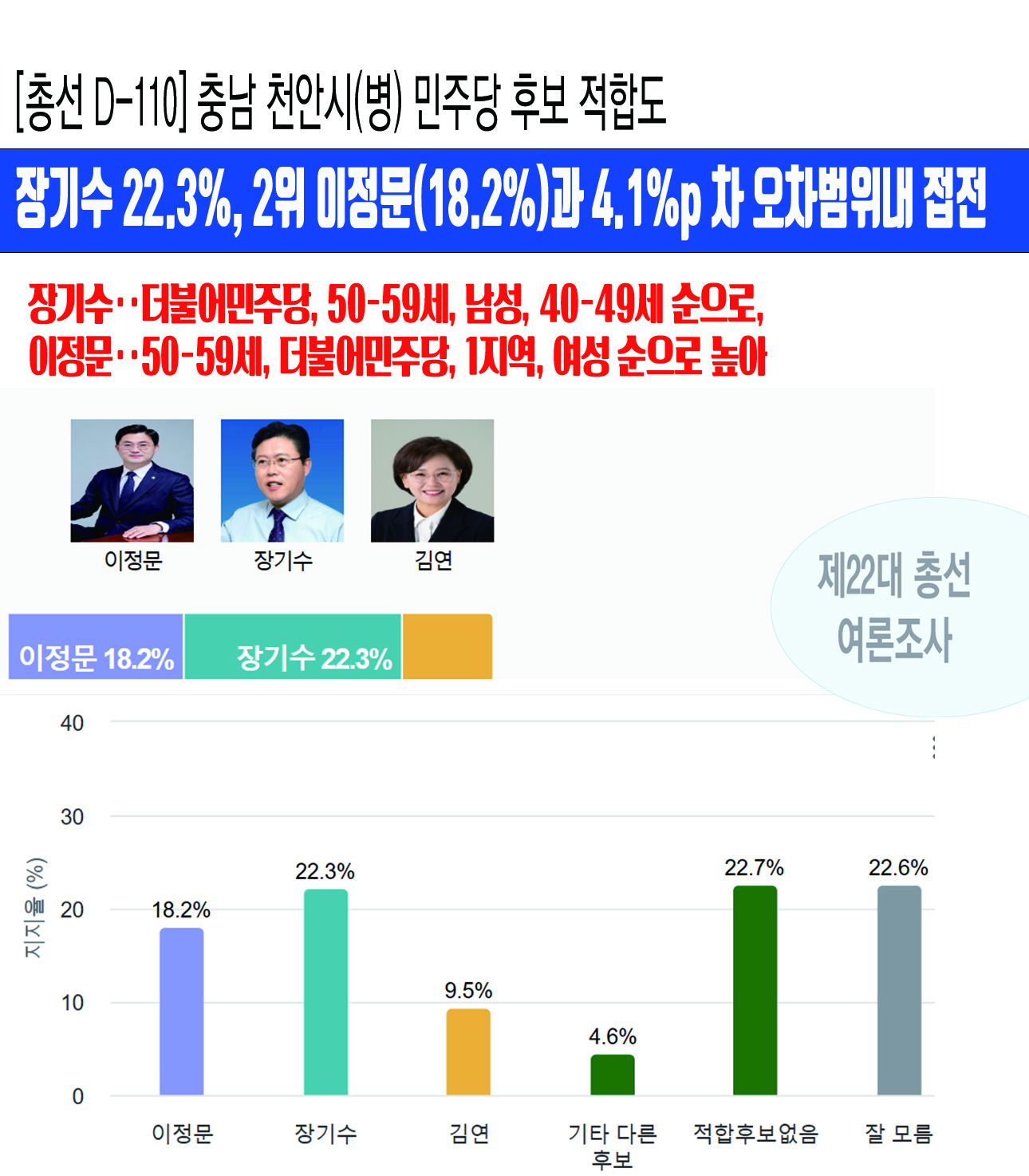 ³»³â Á¦22´ë ±¹È¸ÀÇ¿ø ¼±°Å¸¦ 110ÀÏ ¾ÕµÎ°í Á¶»çµÈ ÃæÃ»³²µµ õ¾È½Ã(º´) ¼±°Å±¸ ¡¸´õºÒ¾î¹ÎÁÖ´ç Èĺ¸ÀûÇÕµµ¡¹¿©·ÐÁ¶»ç¿¡¼ Àå±â¼ö Àü ÀÌÀç¸í ´ëÅë·ÉÈĺ¸Ãæ³²°øµ¿»óȲ½ÇÀåÀÌ 22.3%¸¦ ¾ò¾î 18.2%¸¦ ¾òÀº ÀÌÁ¤¹® Çö ±¹È¸ÀÇ¿ø¿Í 4.1%p Â÷ÀÌ·Î Á¢ÀüÀ» ¹úÀÌ´Â °ÍÀ¸·Î ³ªÅ¸³µ´Ù.