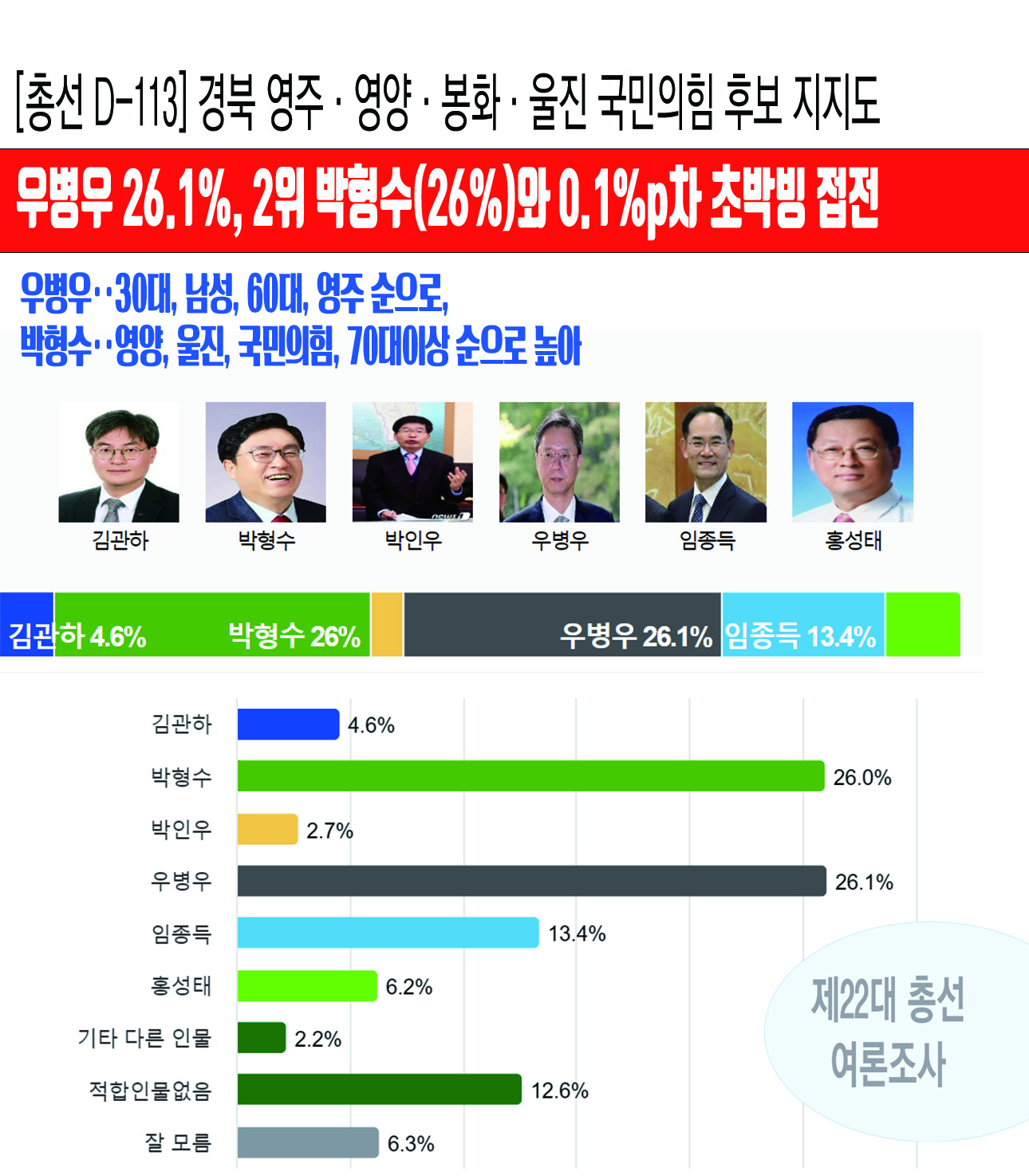 [ÃѼ± D-113] °æºÏ ¿µÁÖ¡¤¿µ¾ç¡¤ºÀÈ¡¤¿ïÁø ±¹¹ÎÀÇÈû Èĺ¸ ÁöÁöµµ¡¤¡¤¡¤¿ìº´¿ì 26.1%, 2À§ ¹ÚÇü¼ö(26%)¿Í 0.1%pÂ÷ Ãʹںù Á¢Àü