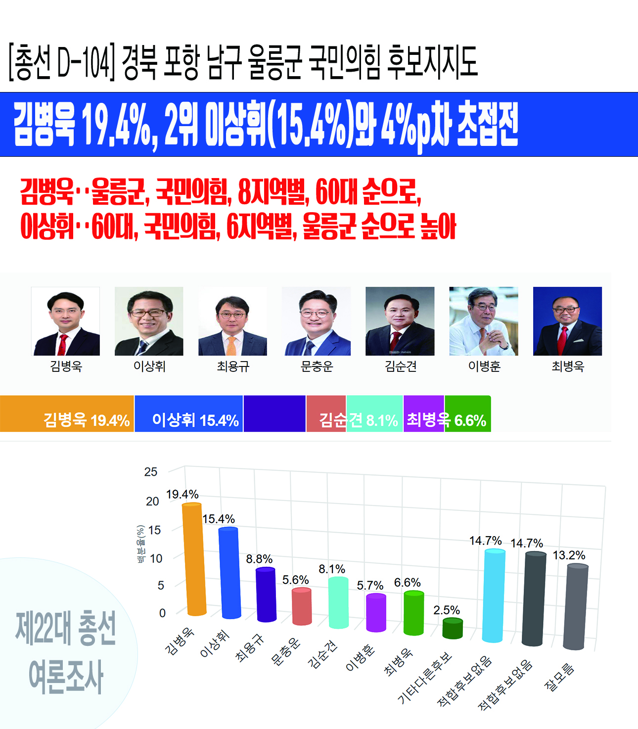 [ÃѼ± D-104] °æºÏ Æ÷Ç× ³²±¸ ¿ï¸ª±º ±¹¹ÎÀÇÈû Èĺ¸ÁöÁöµµ¡¤¡¤¡¤±èº´¿í 19.4%, 2À§ ÀÌ»óÈÖ(15.4%)¿Í 4%pÂ÷ ÃÊÁ¢Àü