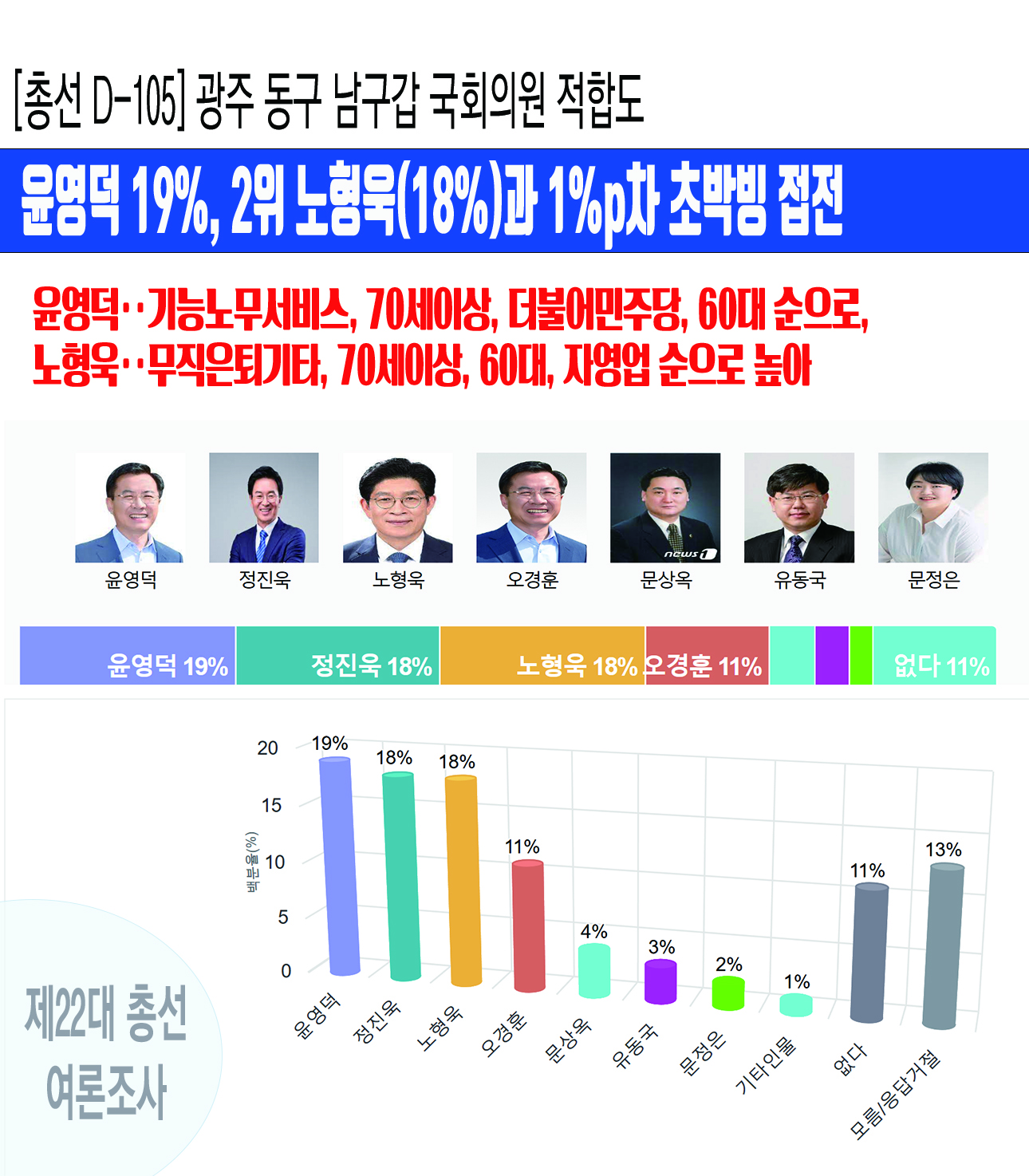 [ÃѼ± D-105] ±¤ÁÖ µ¿±¸ ³²±¸°© ±¹È¸ÀÇ¿ø¡¤¡¤¡¤À±¿µ´ö 19%, 2À§ ³ëÇü¿í(18%)°ú 1%pÂ÷ Ãʹںù Á¢Àü