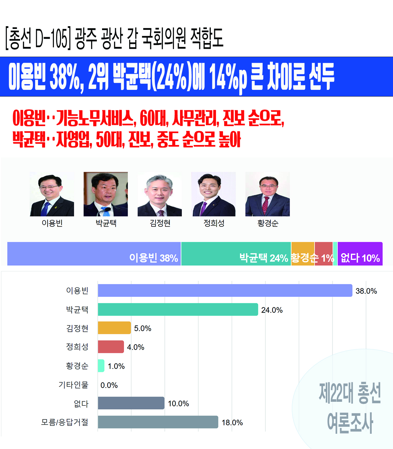 [ÃѼ± D-105] ±¤ÁÖ ±¤»ê °© ±¹È¸ÀÇ¿ø¡¤¡¤¡¤ÀÌ¿ëºó 38%, 2À§ ¹Ú±ÕÅÃ(24%)¿¡ 14%p Å« Â÷ÀÌ·Î ¼±µÎ