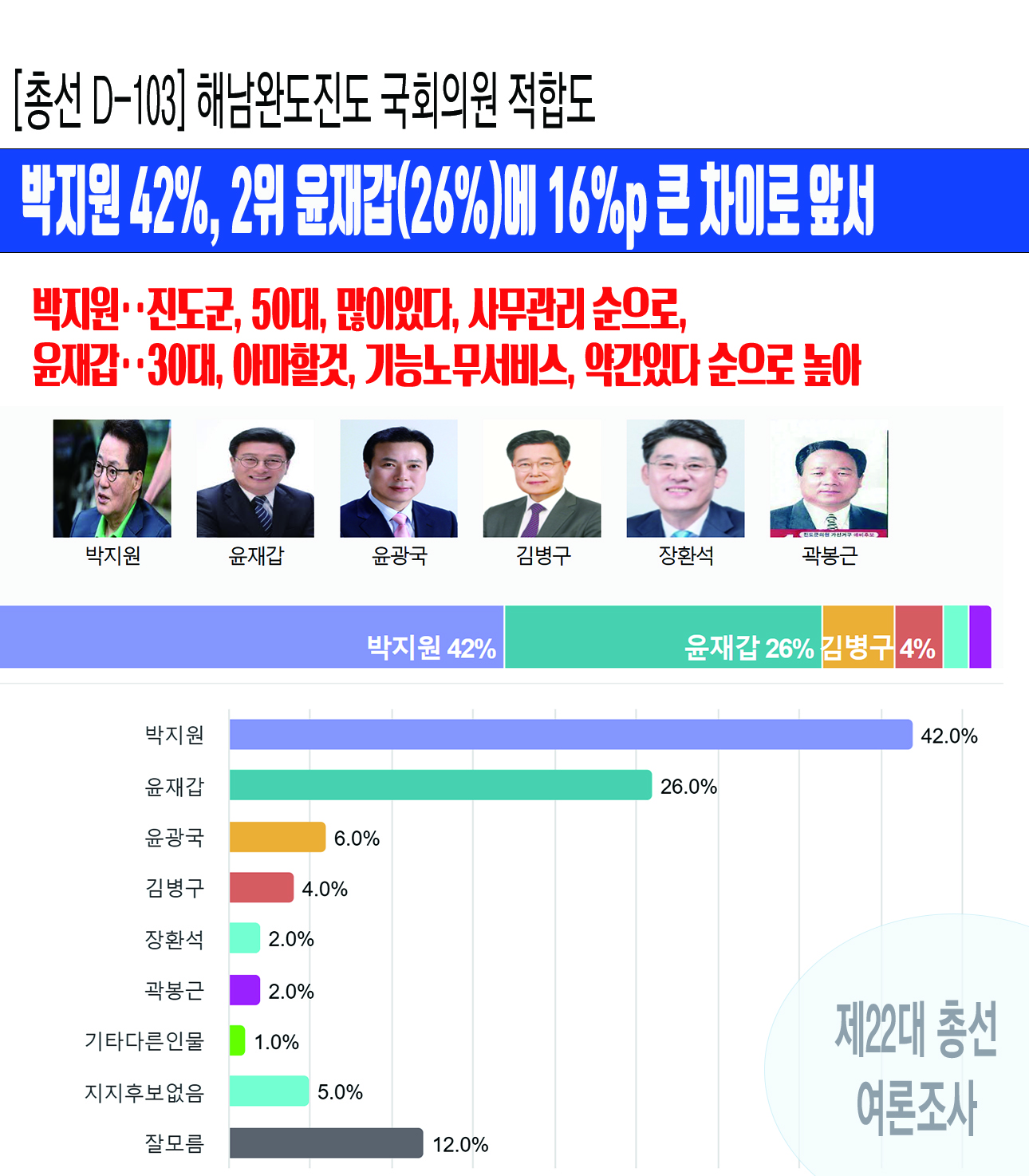 ³»³â Á¦22´ë ±¹È¸ÀÇ¿ø ¼±°Å¸¦ 103ÀÏ ¾ÕµÎ°í Á¶»çµÈ Àü¶ó³²µµ ÇØ³²±º ¿Ïµµ±º Áøµµ±º ¼±°Å±¸ ¡¸Çس²¿ÏµµÁøµµ ±¹È¸ÀÇ¿ø ¼±È£µµ¡¹¿©·ÐÁ¶»ç¿¡¼ ¹ÚÁö¿ø Àü ±¹Á¤¿øÀåÀÌ 42%¸¦ ¾ò¾î 26%¸¦ ¾òÀº À±Àç°© Çö ±¹È¸ÀÇ¿ø¸¦ 16%pÀÇ Å« Â÷ÀÌ·Î ¾Õ¼ ³ª°¡´Â °ÍÀ¸·Î ³ª¿Ô´Ù.