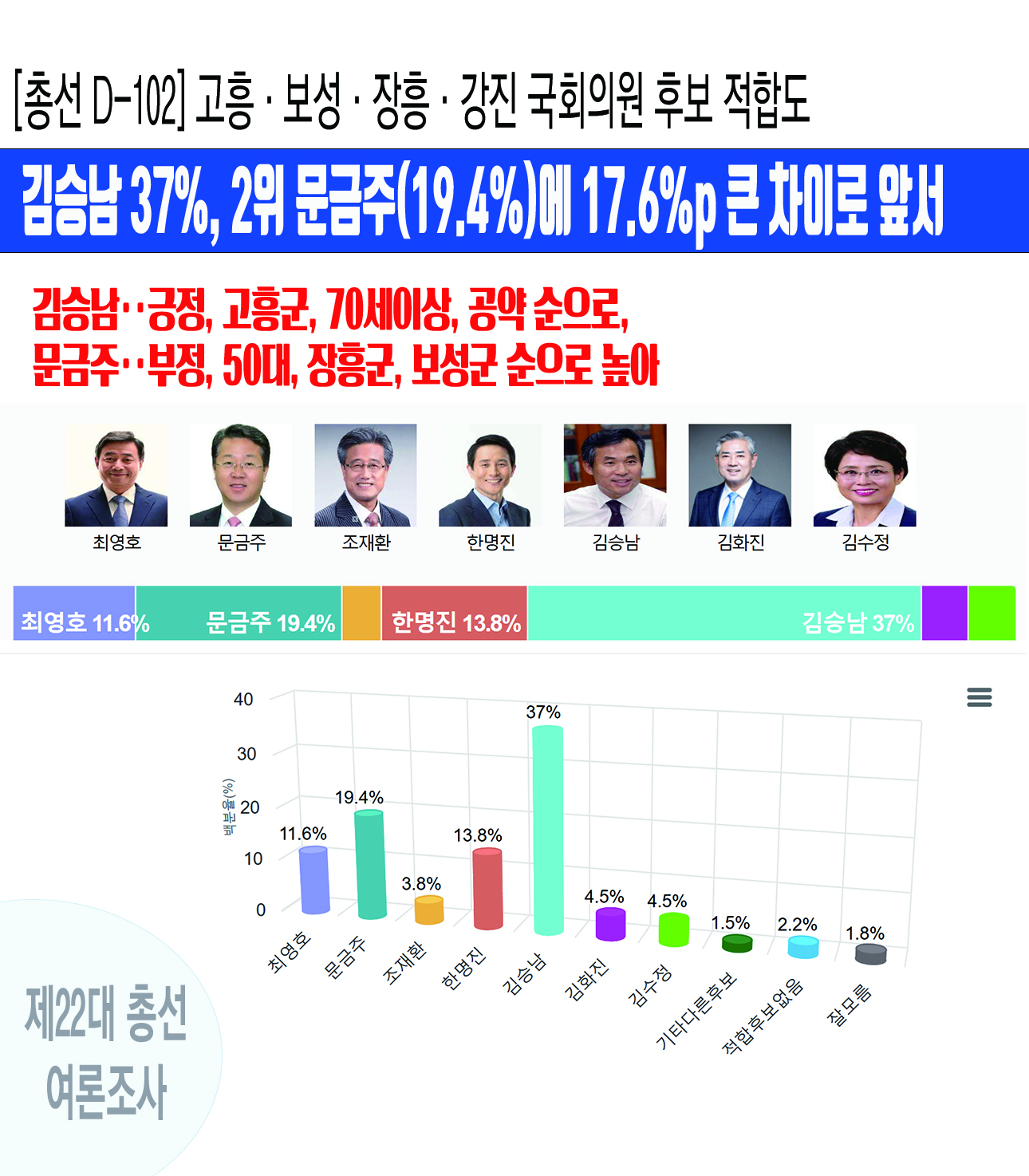 ³»³â Á¦22´ë ±¹È¸ÀÇ¿ø ¼±°Å¸¦ 102ÀÏ ¾ÕµÎ°í Á¶»çµÈ Àü¶ó³²µµ °íÈﱺ º¸¼º±º ÀåÈﱺ °Áø±º ¼±°Å±¸ ¡¸±¹È¸ÀÇ¿ø Èĺ¸ ÀûÇÕµµ¡¹¿©·ÐÁ¶»ç¿¡¼ ±è½Â³² Çö ±¹È¸ÀÇ¿øÀÌ 37%¸¦ ¾ò¾î 19.4%¸¦ ¾òÀº ¹®±ÝÁÖ Àü Àü¶ó³²µµ ÇàÁ¤ºÎÁö»ç¸¦ 17.6%pÀÇ Å« Â÷ÀÌ·Î ¾Õ¼ ³ª°¡´Â °ÍÀ¸·Î ³ª¿Ô´Ù.