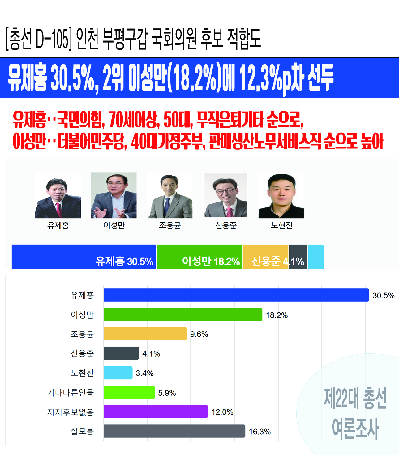 [ÃѼ± D-105] ÀÎõ ºÎÆò±¸°© ±¹È¸ÀÇ¿ø¡¤¡¤¡¤À¯Á¦È« 30.5%, 2À§ À̼º¸¸(18.2%)¿¡ 12.3%pÂ÷ ¼±µÎ