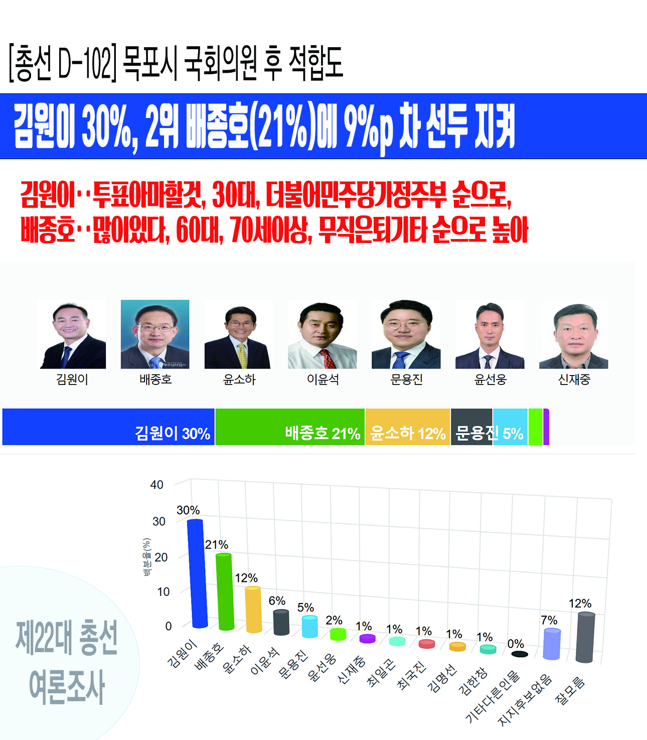[ÃѼ± D-102] ¸ñÆ÷½Ã ±¹È¸ÀÇ¿ø¡¥±è¿øÀÌ 30%, 2À§ ¹èÁ¾È£(21%)¿¡ 9%p Â÷ ¼±µÎ ÁöÄÑ