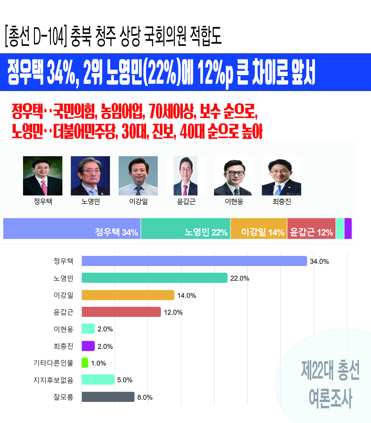 [ÃѼ± D-104] ÃæºÏ ûÁÖ »ó´ç ±¹È¸ÀÇ¿ø¡¤¡¤¡¤Á¤¿ìÅà 34%, 2À§ ³ë¿µ¹Î(22%)¿¡ 12%p Å« Â÷ÀÌ·Î ¾Õ¼