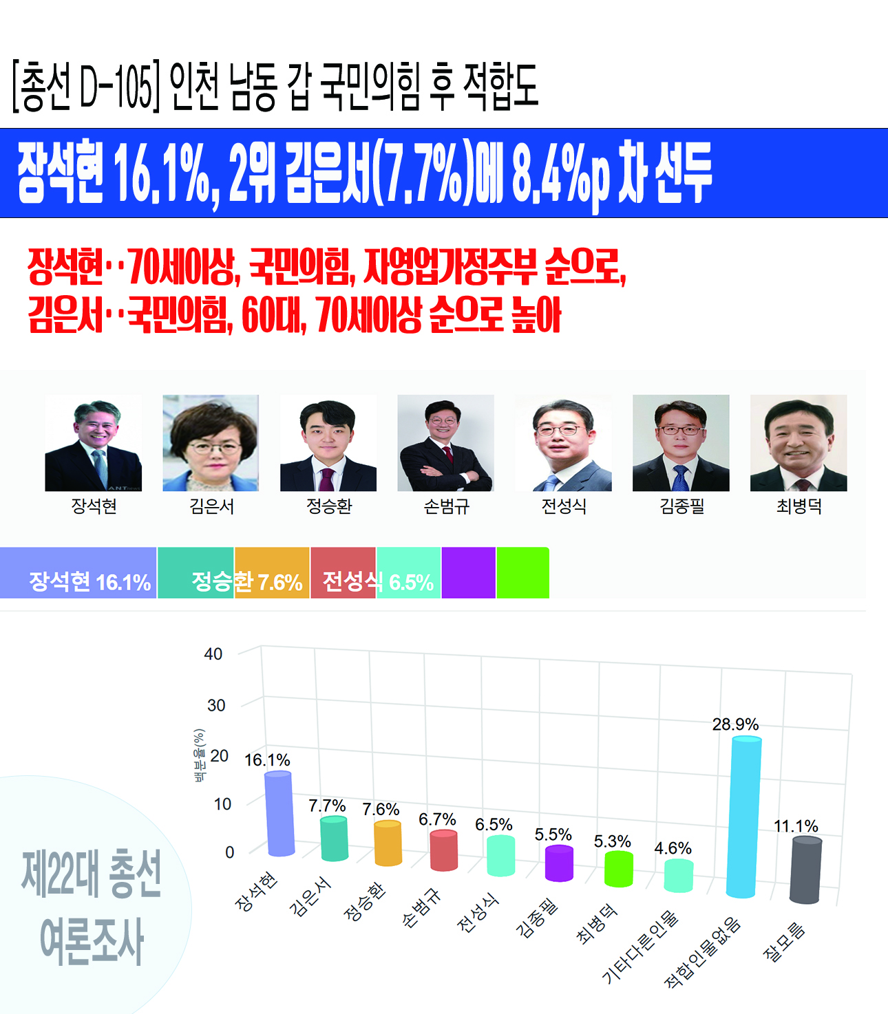 [ÃѼ± D-105] ÀÎõ ³²µ¿ °© ±¹È¸ÀÇ¿ø¡¤¡¤¡¤Àå¼®Çö 16.1%, 2À§ ±èÀº¼(7.7%)¿¡ 8.4%p Â÷ ¼±µÎ