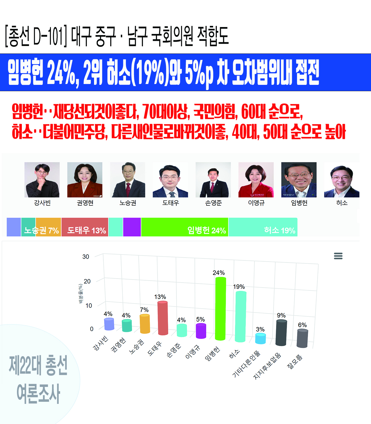 [ÃѼ± D-101] ´ë±¸ Áß±¸¡¤³²±¸ ±¹È¸ÀÇ¿ø¡¤¡¤¡¤ÀÓº´Çå 24%, 2À§ Çã¼Ò(19%)¿Í 5%p Â÷ ¿ÀÂ÷¹üÀ§³» Á¢Àü