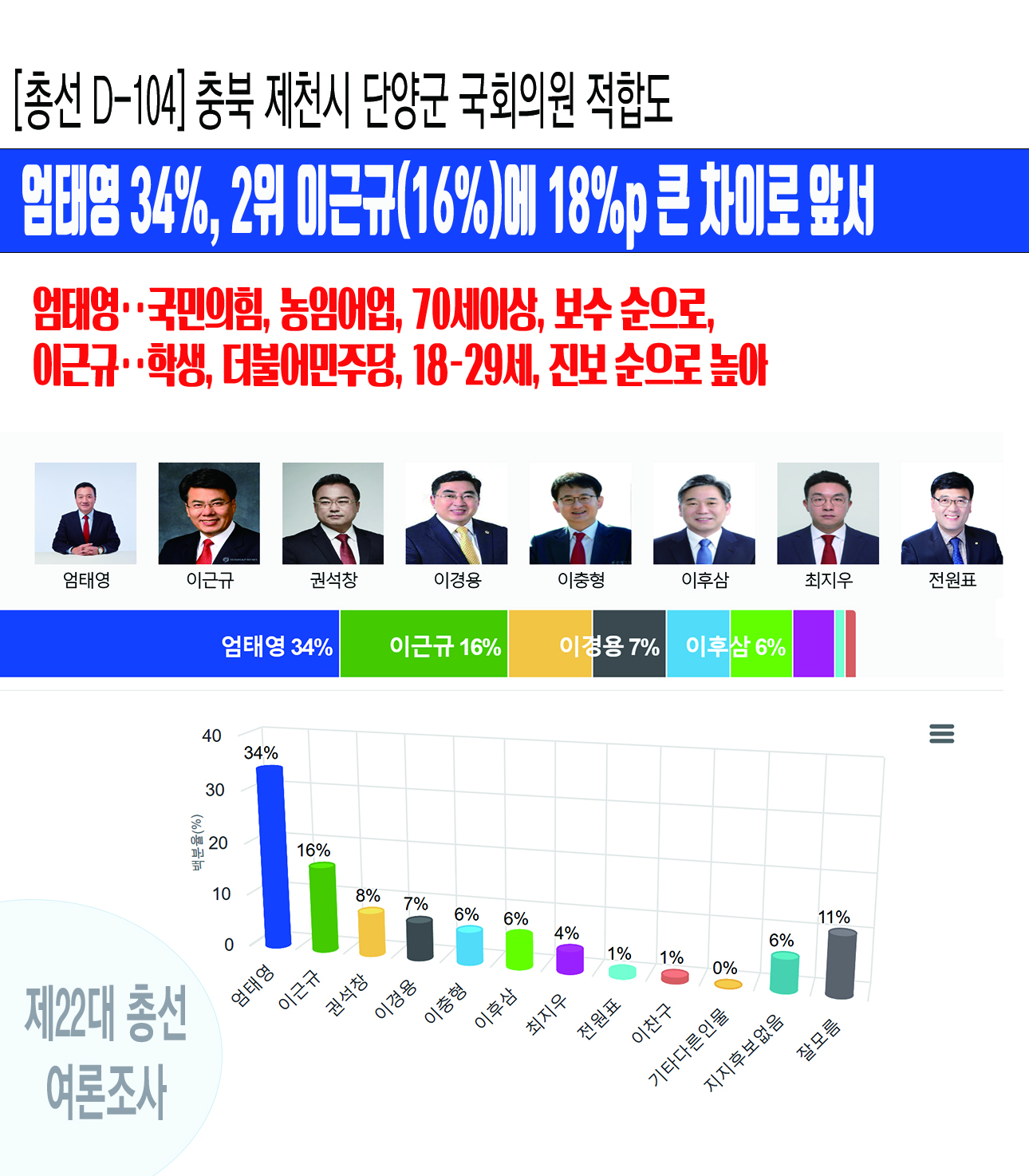 [ÃѼ± D-104] ÃæºÏ Á¦Ãµ½Ã ´Ü¾ç±º ±¹È¸ÀÇ¿ø¡¤¡¤¡¤¾öÅ¿µ 34%, 2À§ À̱ٱÔ(16%)¿¡ 18%p Å« Â÷ÀÌ·Î ¾Õ¼