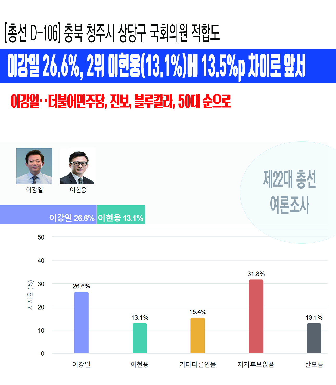 [ÃѼ± D-106] ÃæºÏ ûÁֽà »ó´ç±¸ ±¹È¸ÀÇ¿ø¡¤¡¤¡¤À̰ÀÏ 26.6%, 2À§ ÀÌÇö¿õ(13.1%)¿¡ 13.5%p Â÷ÀÌ·Î ¾Õ¼