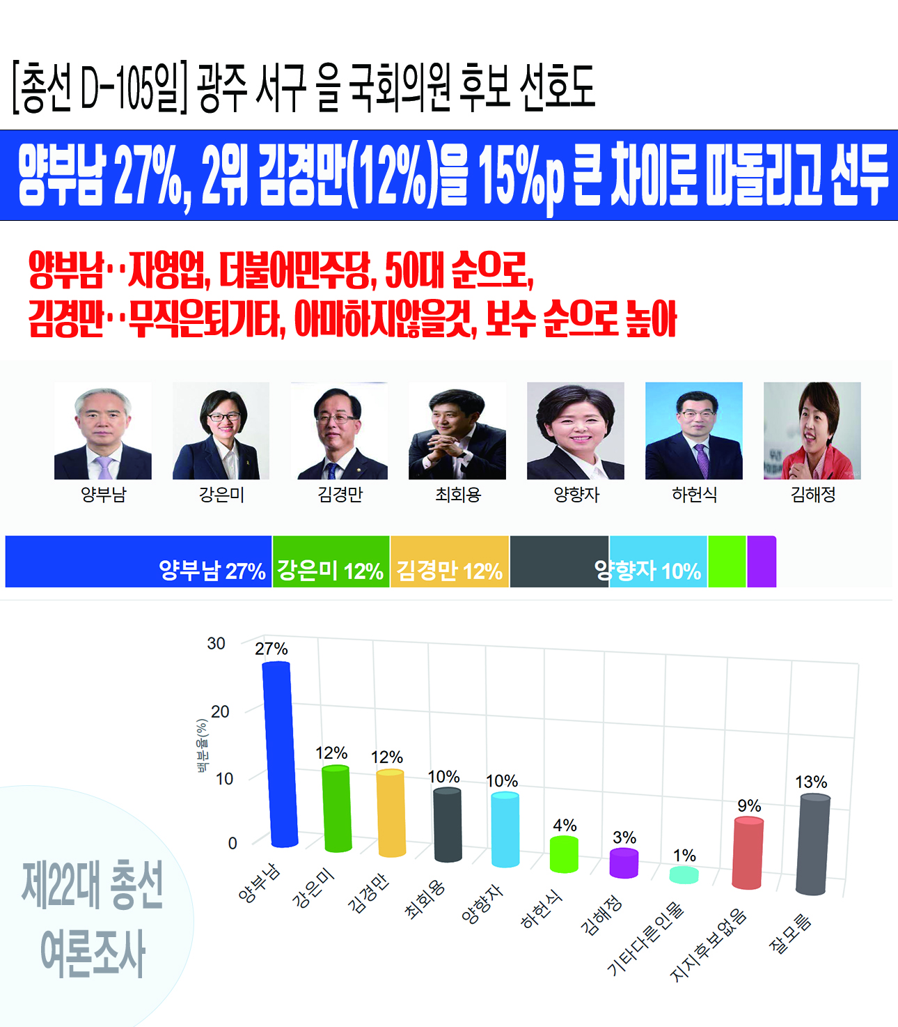 ³»³â Á¦22´ë ±¹È¸ÀÇ¿ø ¼±°Å¸¦ 105ÀÏ ¾ÕµÎ°í Á¶»çµÈ ±¤ÁÖ±¤¿ª½Ã ¼±¸ À» ¼±°Å±¸ ¡¸±¤ÁÖ ¼±¸ À» ±¹È¸ÀÇ¿ø Èĺ¸ ¼±È£µµ¡¹¿©·ÐÁ¶»ç¿¡¼ ¾çºÎ³² Çö ¹ÎÁÖ´ç ¹ý·üÀ§¿øÀåÀÌ 27%¸¦ ¾ò¾î 12%¸¦ ¾òÀº ±è°æ¸¸ Çö ±¹È¸ÀÇ¿øÀ» 15%pÀÇ Å« Â÷ÀÌ·Î ¾Õ¼ ³ª°¡´Â °ÍÀ¸·Î ³ª¿Ô´Ù.