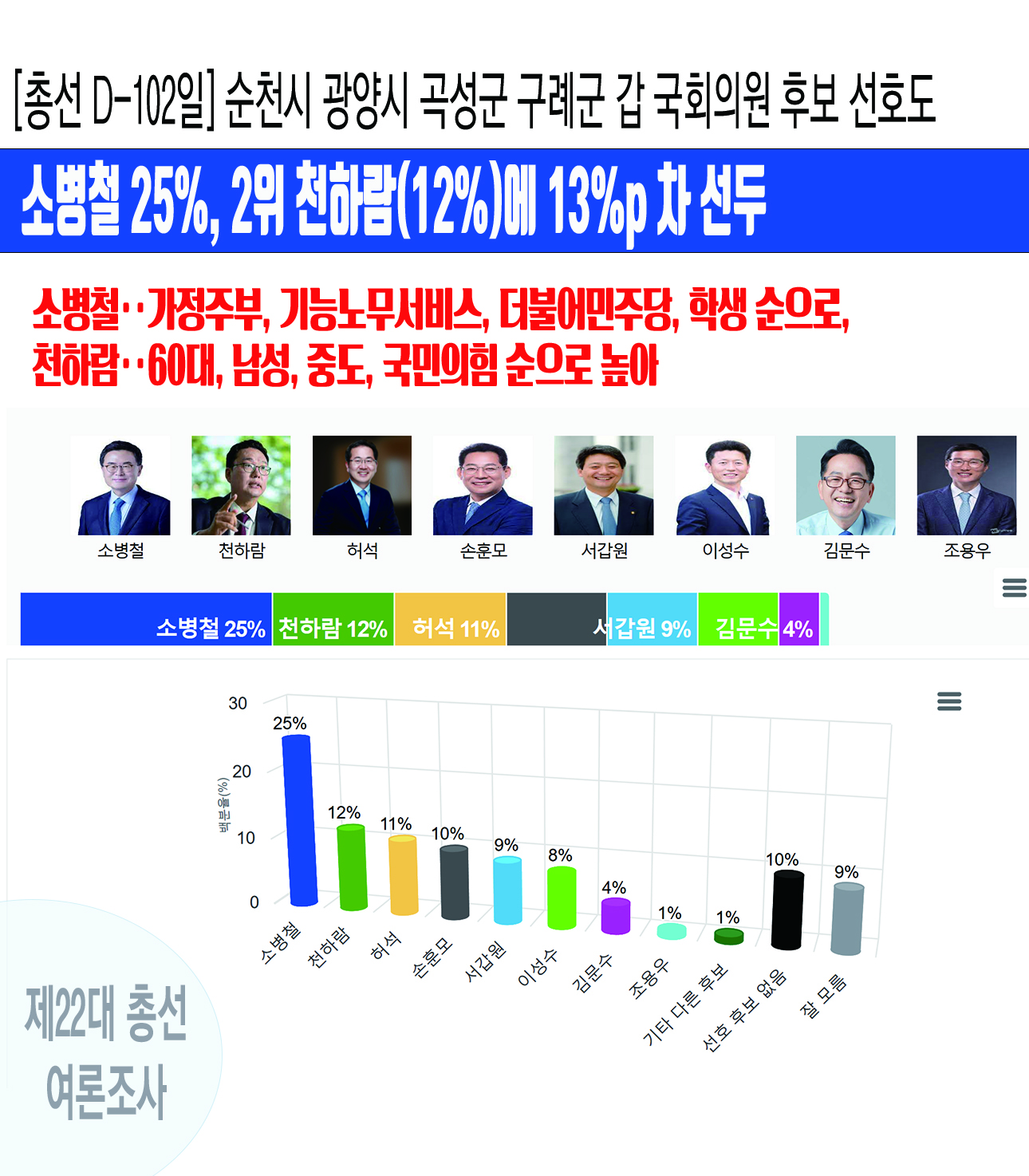 [ÃѼ± D-102ÀÏ] ¼øÃµ½Ã ±¤¾ç½Ã °î¼º±º ±¸·Ê±º °© ±¹È¸ÀÇ¿ø¡¤¡¤¡¤¼Òº´Ã¶ 25%, 2À§ õÇ϶÷(12%)¿¡ 13%p Â÷ ¼±µÎ