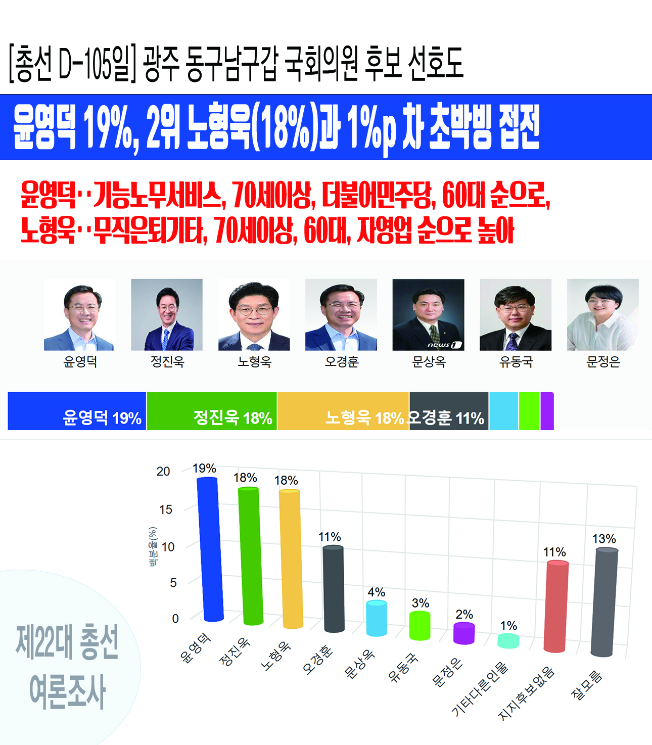 [ÃѼ± D-105ÀÏ] ±¤ÁÖ µ¿±¸³²±¸°© ±¹È¸ÀÇ¿ø¡¤¡¤¡¤À±¿µ´ö 19%, 2À§ ³ëÇü¿í(18%)°ú 1%p Â÷ Ãʹںù Á¢Àü