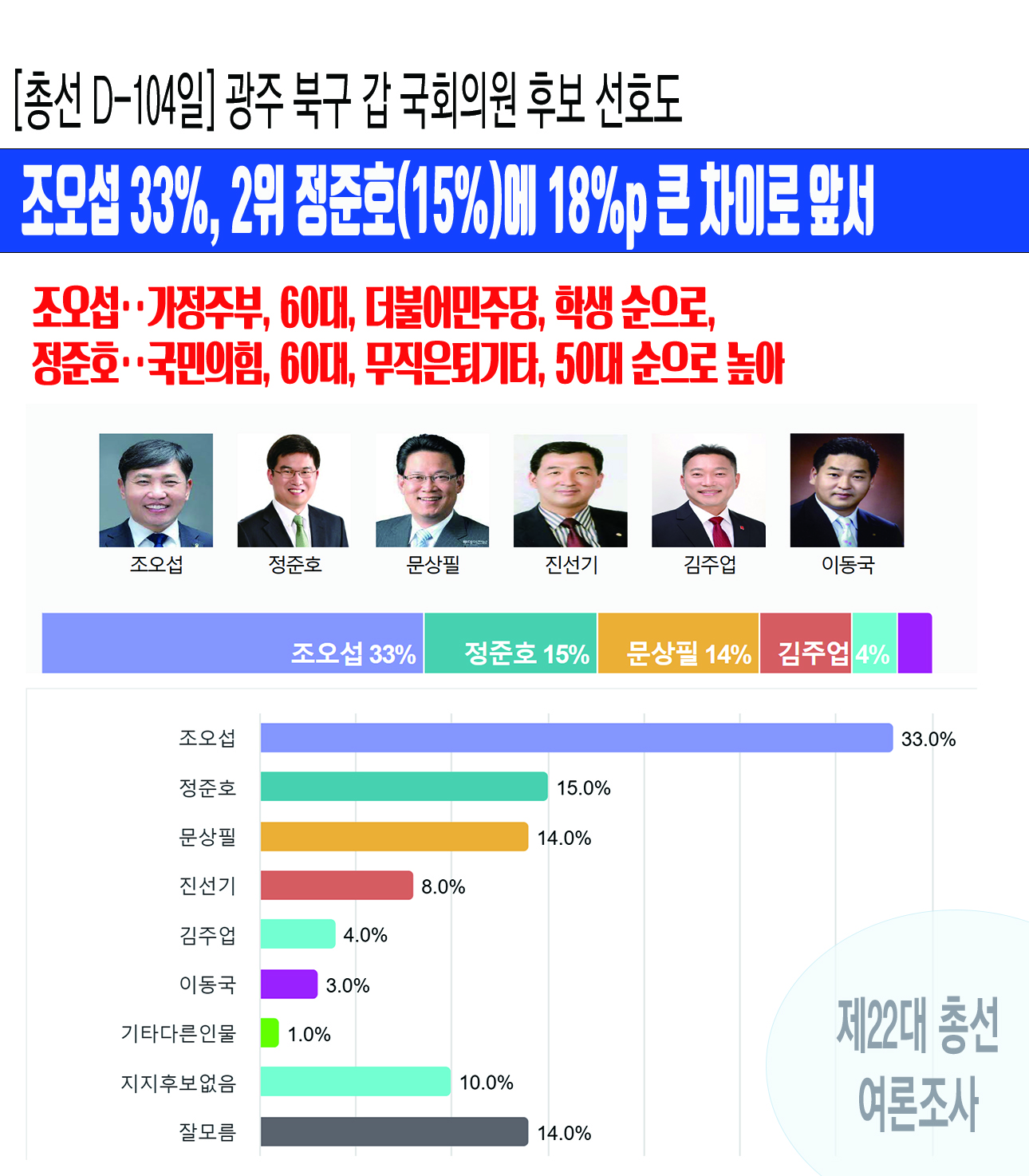 [ÃѼ± D-104ÀÏ] ±¤ÁÖ ºÏ±¸ °© ±¹È¸ÀÇ¿ø¡¤¡¤¡¤Á¶¿À¼· 33%, 2À§ Á¤ÁØÈ£(15%)¿¡ 18%p Å« Â÷ÀÌ·Î ¾Õ¼
