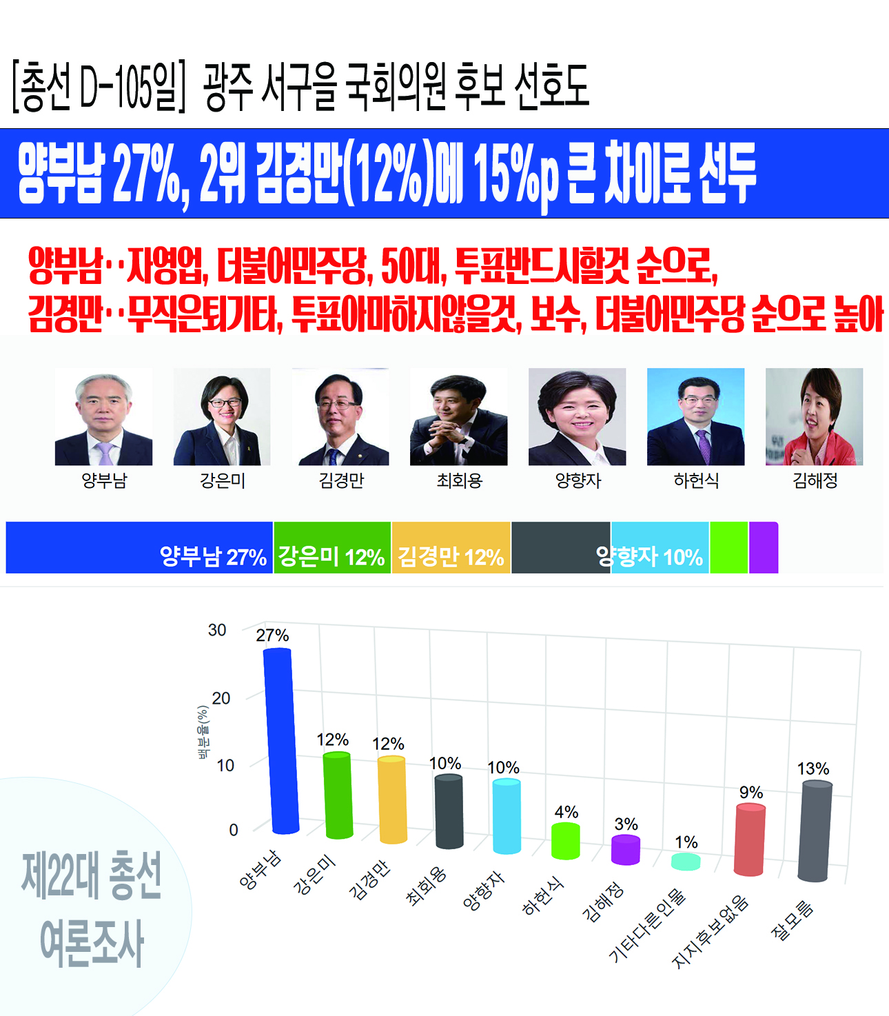 [ÃѼ± D-105ÀÏ] ±¤ÁÖ ¼±¸À» ±¹È¸ÀÇ¿ø¡¤¡¤¡¤¾çºÎ³² 27%, 2À§ ±è°æ¸¸(12%)¿¡ 15%p Å« Â÷ÀÌ·Î ¼±µÎ