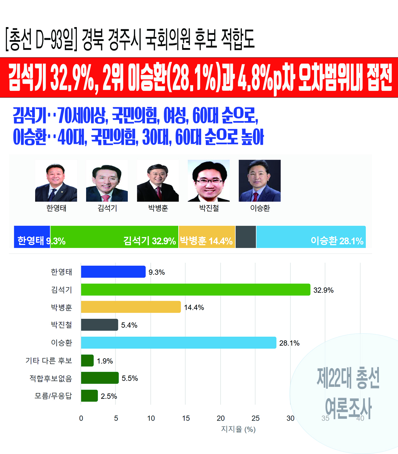 [ÃѼ± D-93ÀÏ] °æºÏ °æÁֽà ±¹È¸ÀÇ¿ø¡¤¡¤¡¤±è¼®±â 32.9%, 2À§ À̽Âȯ(28.1%)°ú 4.8%pÂ÷ ¿ÀÂ÷¹üÀ§³» Á¢Àü