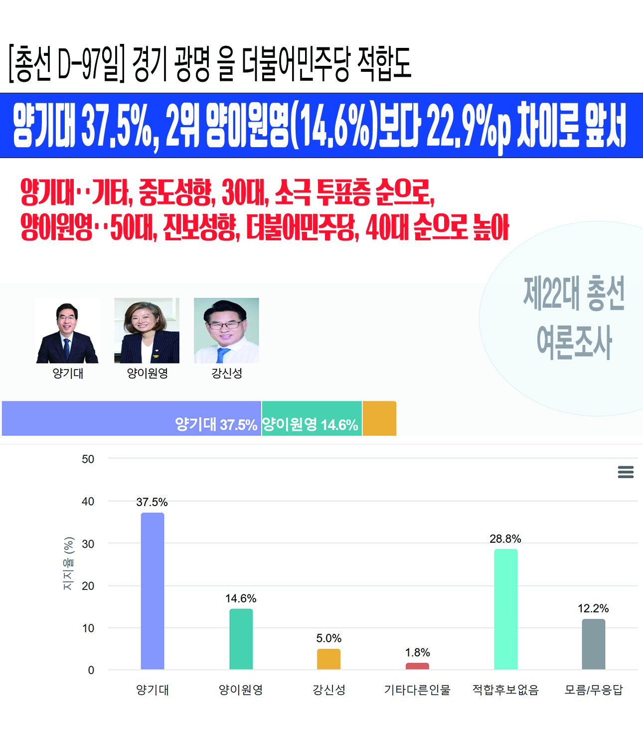 [ÃѼ± D-97ÀÏ] °æ±â ±¤¸í À» ´õºÒ¾î¹ÎÁÖ´ç ÀûÇÕµµ¡¤¡¤¡¤¾ç±â´ë 37.5%, 2À§ ¾çÀÌ¿ø¿µ(14.6%)º¸´Ù 22.9%p Â÷ÀÌ·Î ¾Õ¼­