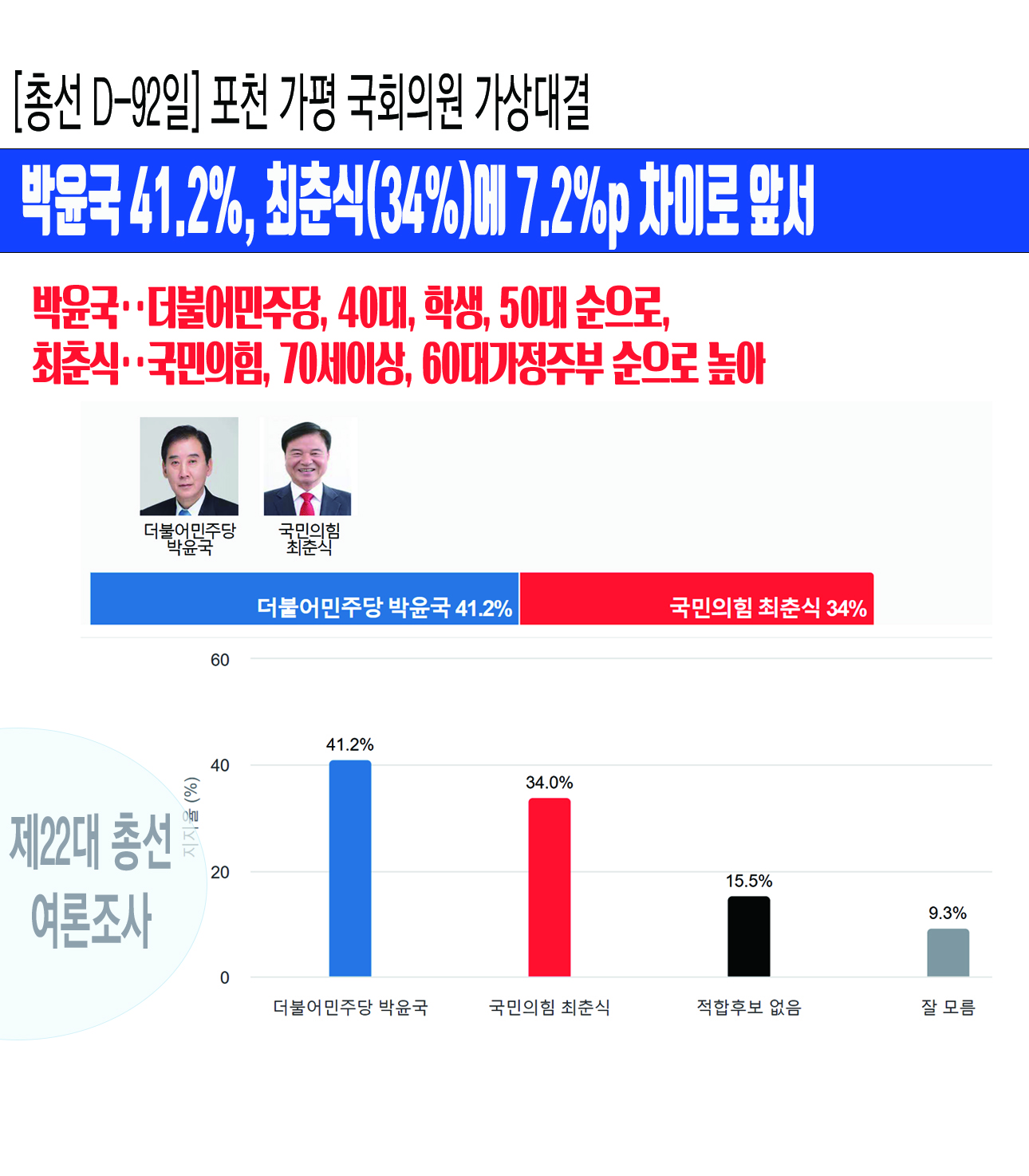³»³â Á¦22´ë ±¹È¸ÀÇ¿ø ¼±°Å¸¦ 92ÀÏ ¾ÕµÎ°í Á¶»çµÈ °æ±âµµ Æ÷õ½Ã °¡Æò±º ¼±°Å±¸ ¡¸¹ÚÀ±±¹ vs ÃÖÃá½Ä °¡»ó´ë°á¡¹¿©·ÐÁ¶»ç¿¡¼ ¹ÚÀ±±¹ Àü Æ÷õ½ÃÀåÀÌ 41.2%¸¦ ¾ò¾î 34%¸¦ ¾òÀº '±¹¹ÎÀÇÈû ÃÖÃá½Ä' È常¦ 7.2%pÀÇ Â÷ÀÌ·Î ¾Õ¼ ³ª°¡´Â °ÍÀ¸·Î ³ª¿Ô´Ù.