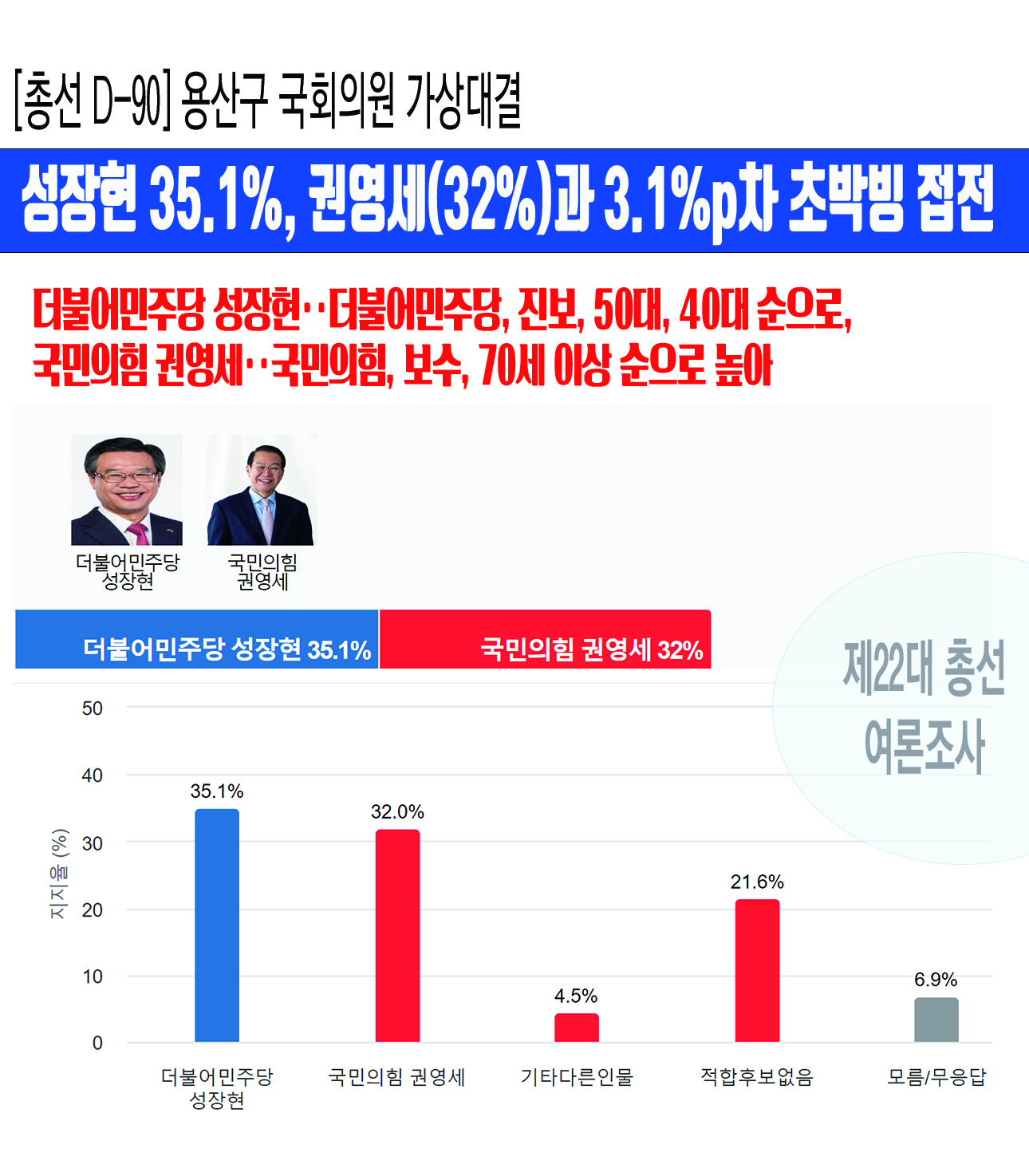 ³»³â Á¦22´ë ±¹È¸ÀÇ¿ø ¼±°Å¸¦ 90ÀÏ ¾ÕµÎ°í Á¶»çµÈ ¼¿ïƯº°½Ã ¿ë»ê±¸ ¼±°Å±¸ ¡¸°¡»ó´ë°á ¼ºÀåÇö vs ±Ç¿µ¼¼¡¹¿©·ÐÁ¶»ç¿¡¼ ´õºÒ¾î¹ÎÁÖ´ç ¼ºÀåÇö Àü ¿ë»ê±¸Ã»ÀåÀÌ 35.1%¸¦ ¾ò¾î 32%¸¦ ¾òÀº ±¹¹ÎÀÇÈû ±Ç¿µ¼¼ Çö ±¹È¸ÀÇ¿ø°ú 3.1%p Â÷ÀÌ·Î ÃÊ Á¢ÀüÀ» ¹úÀÌ´Â °ÍÀ¸·Î ³ªÅ¸³µ´Ù.