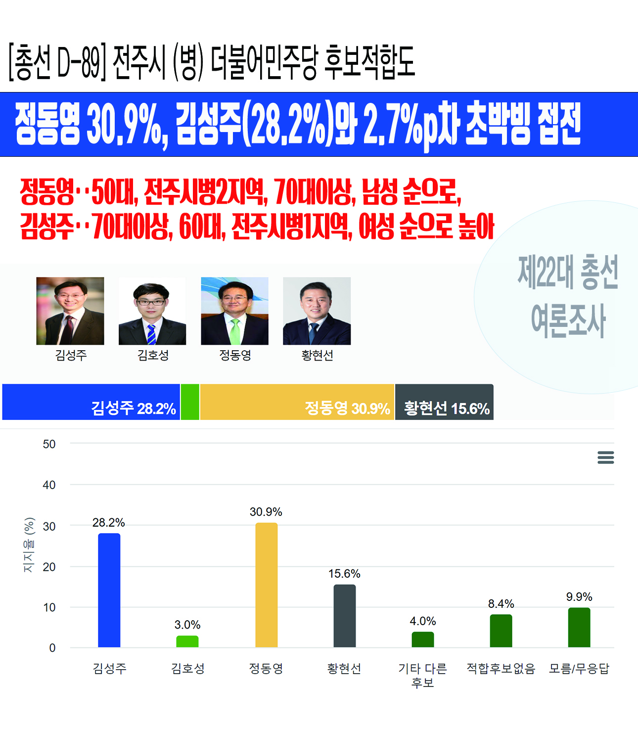 ¡¸Á¤µ¿¿µ¡¹È帴 "ÀüÁֽú´2Áö¿ª" Áö¿ª¿¡¼ 2À§¸¦ Â÷ÁöÇÑ ¡¸±è¼ºÁÖ¡¹È常¦ 10%p ÀÌ»ó Å« Â÷ÀÌ·Î µûµ¹¸®¸ç ³ôÀº ÁöÁö¸¦ ¹Þ¾Ò´Ù.