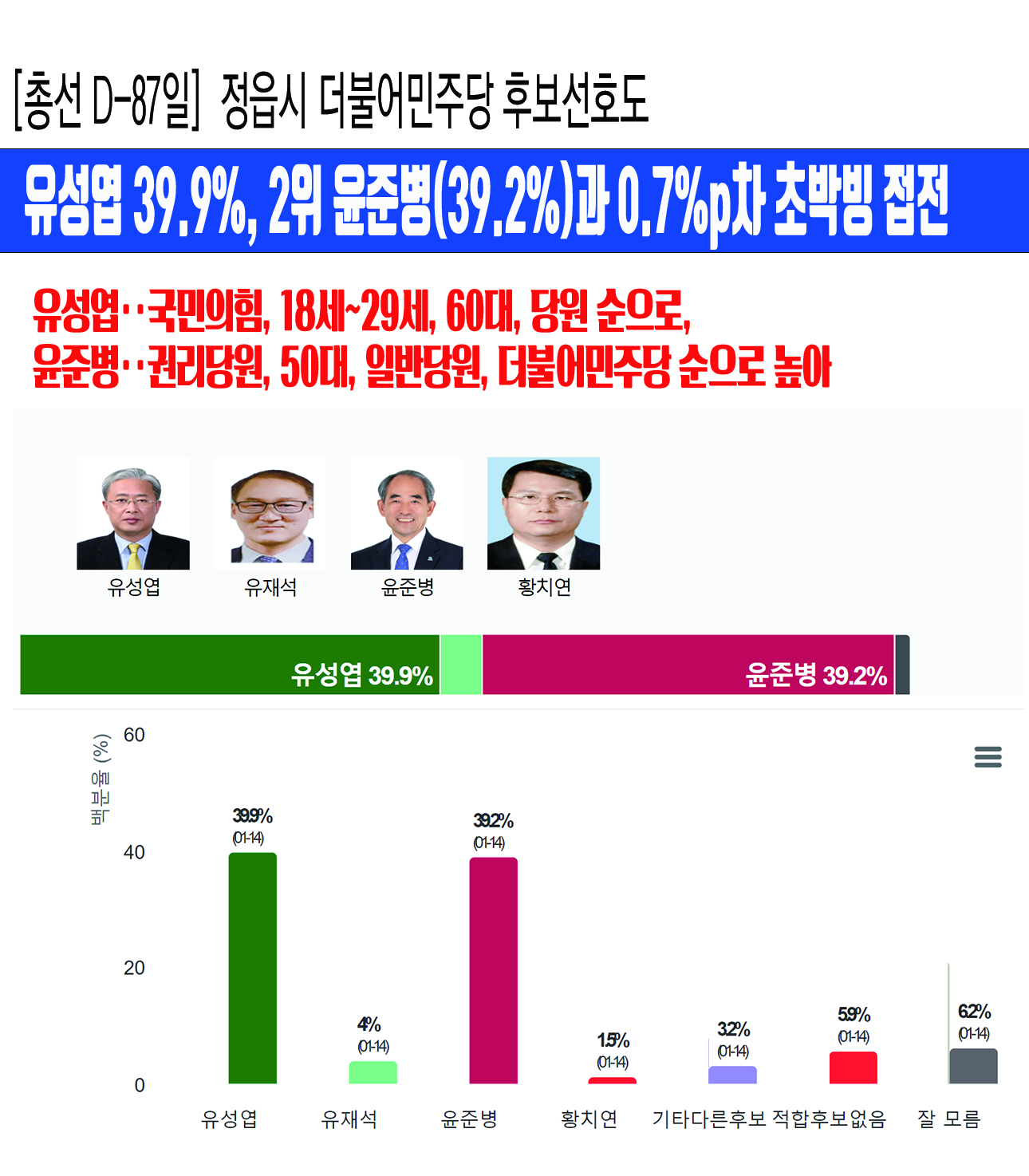 ³»³â Á¦22´ë ±¹È¸ÀÇ¿ø ¼±°Å¸¦ 87ÀÏ ¾ÕµÎ°í Á¶»çµÈ Àü¶óºÏµµ Á¤À¾½Ã °íⱺ ¼±°Å±¸ ¡¸´õºÒ¾î¹ÎÁÖ´ç Èĺ¸¼±È£µµ¡¹¿©·ÐÁ¶»ç¿¡¼ À¯¼º¿± Á¦18´ë 19´ë 20´ë ±¹È¸ÀÇ¿øÀÌ 39.9%¸¦ ¾ò¾î 39.2%¸¦ ¾òÀº À±Áغ´ Çö Á¦21´ë ±¹È¸ÀÇ¿ø°ú 0.7%p Â÷ÀÌ·Î ÃÊ ¹ÚºùÀÇ Á¢ÀüÀ» ¹úÀÌ´Â °ÍÀ¸·Î ³ªÅ¸³µ´Ù.