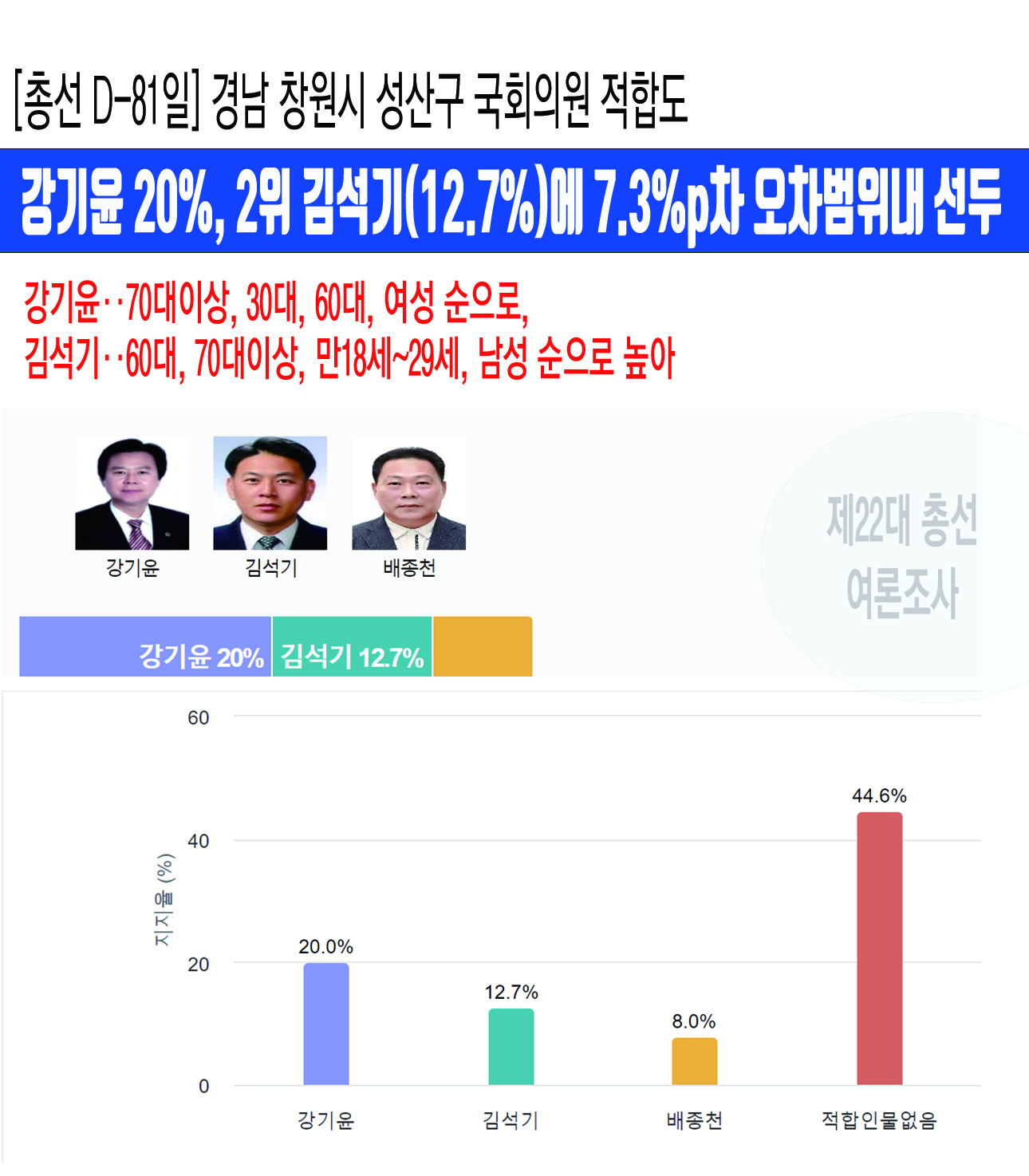 [ÃѼ± D-81ÀÏ] °æ³² â¿ø½Ã ¼º»ê±¸ ±¹È¸ÀÇ¿ø¡¤¡¤¡¤°±âÀ± 20%, 2À§ ±è¼®±â(12.7%)¿¡ 7.3%pÂ÷ ¿ÀÂ÷¹üÀ§³» ¼±µÎ