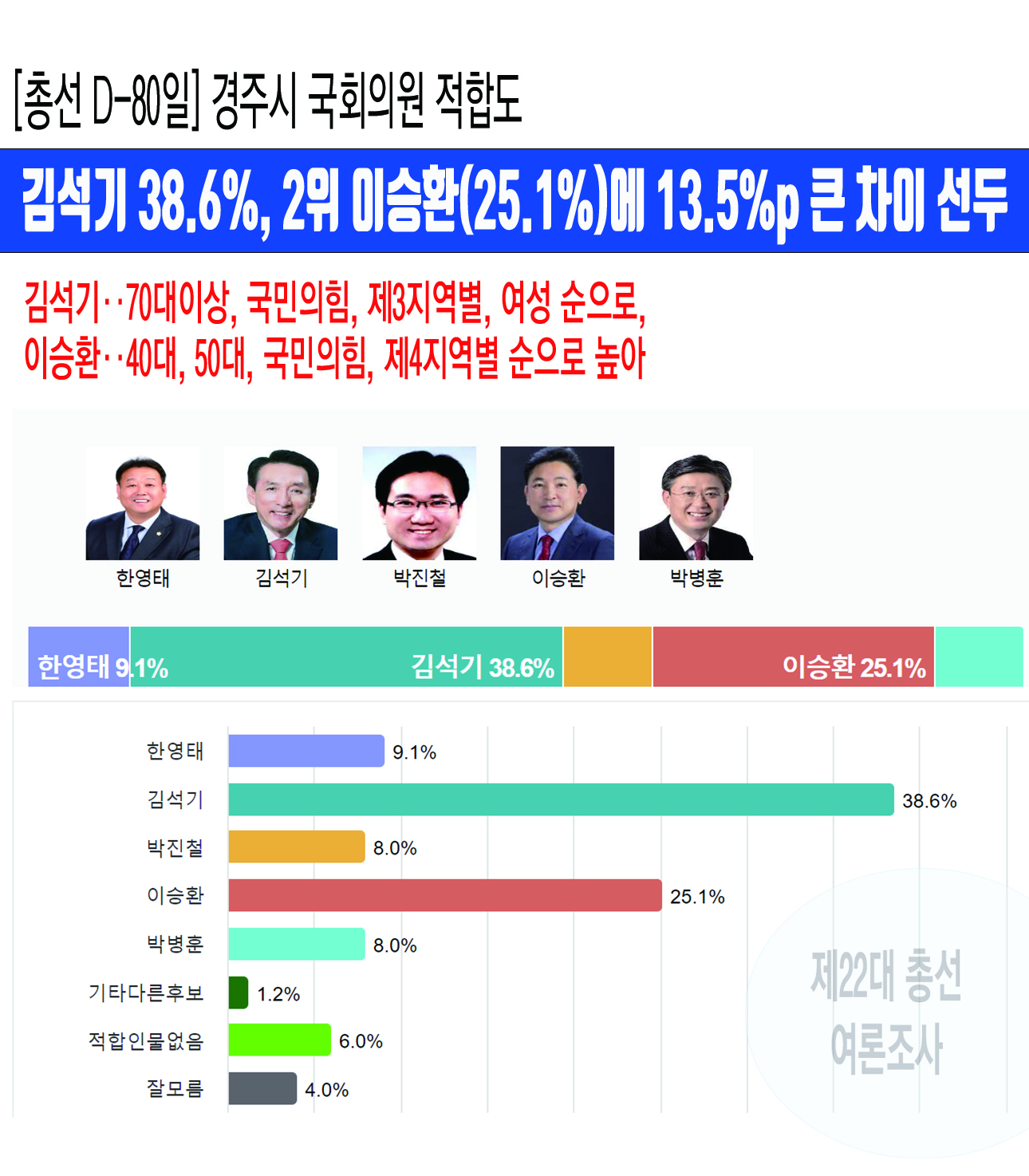 [ÃѼ± D-80ÀÏ] °æÁֽà ±¹È¸ÀÇ¿ø¡¤¡¤¡¤±è¼®±â 38.6%, 2À§ À̽Âȯ(25.1%)¿¡ 13.5%p Å« Â÷ÀÌ ¼±µÎ