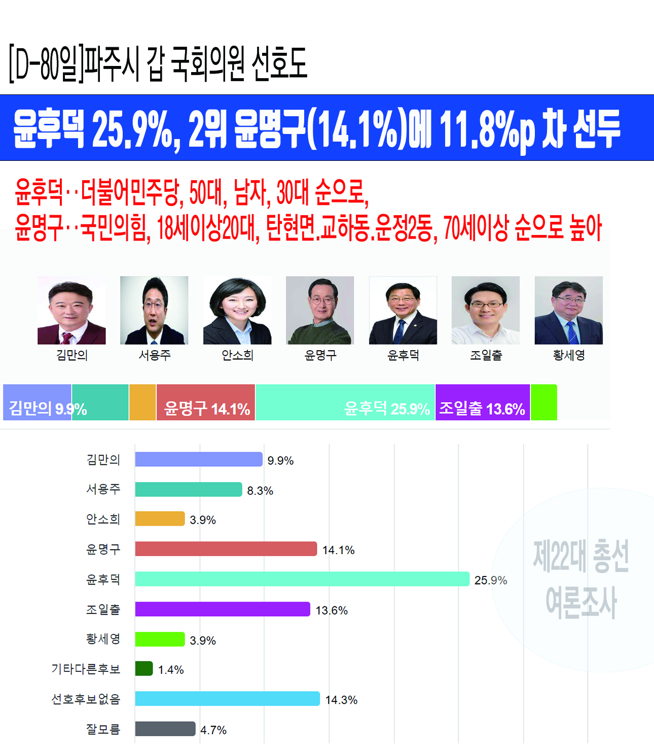 ³»³â Á¦22´ë ±¹È¸ÀÇ¿ø ¼±°Å¸¦ 80ÀÏ ¾ÕµÎ°í Á¶»çµÈ °æ±âµµ ÆÄÁֽà °© ¼±°Å±¸ ¡¸ÆÄÁֽà °© ±¹È¸ÀÇ¿ø ¼±È£µµ¡¹¿©·ÐÁ¶»ç¿¡¼­ À±ÈÄ´ö Çö ±¹È¸ÀÇ¿øÀÌ 25.9%¸¦ ¾ò¾î 14.1%¸¦ ¾òÀº À±¸í±¸ Çö ±¹¹ÎÀÇÈû °æ±âµµ´ç ºÎÀ§¿øÀåÀ» 11.8%p Â÷ÀÌ·Î ¾Õ¼­ ³ª°¡´Â °ÍÀ¸·Î ³ª¿Ô´Ù.