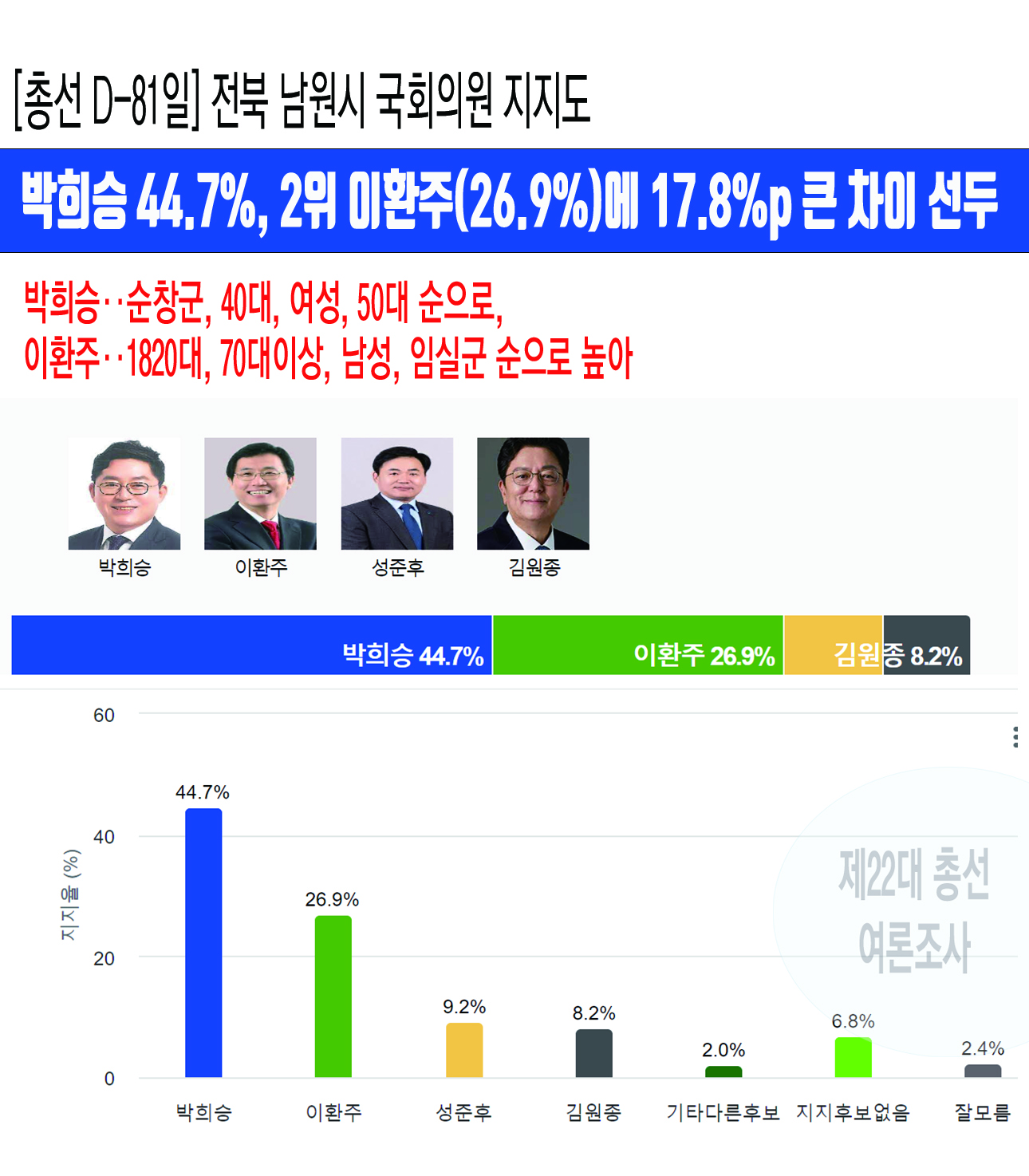 [ÃѼ± D-81ÀÏ] ÀüºÏ ³²¿ø½Ã ±¹È¸ÀÇ¿ø¡¤¡¤¡¤¹ÚÈñ½Â 44.7%, 2À§ ÀÌȯÁÖ(26.9%)¿¡ 17.8%p Å« Â÷ÀÌ ¼±µÎ