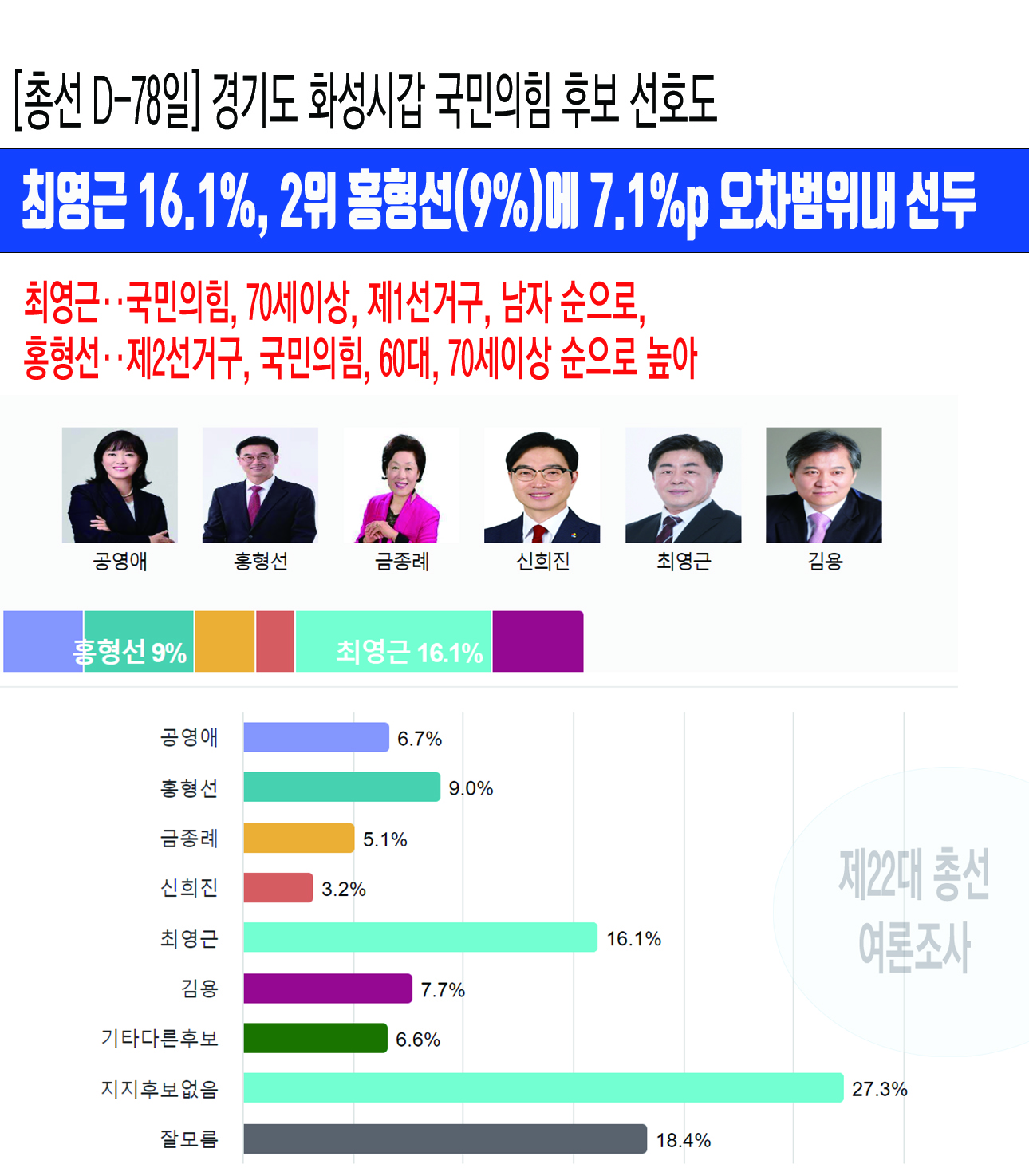 ³»³â Á¦22´ë ±¹È¸ÀÇ¿ø ¼±°Å¸¦ 78ÀÏ ¾ÕµÎ°í Á¶»çµÈ °æ±âµµ ȼº½Ã °© ¼±°Å±¸ ¡¸È¼º½Ã°© ±¹¹ÎÀÇÈû Èĺ¸ ¼±È£µµ¡¹¿©·ÐÁ¶»ç¿¡¼ 'ÃÖ¿µ±Ù' È帰¡ 16.1%¸¦ ¾ò¾î 9%¸¦ ¾òÀº 'È«Çü¼±' È常¦ 7.1%pÀÇ Â÷ÀÌ·Î ¾Õ¼ ³ª°¡´Â °ÍÀ¸·Î ³ª¿Ô´Ù.