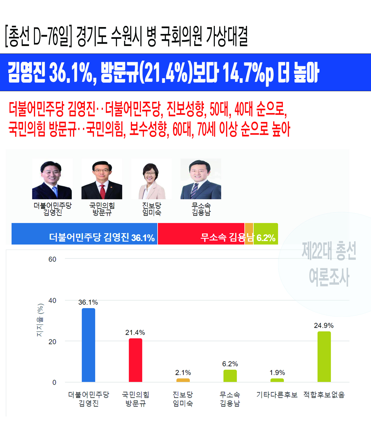 [ÃѼ± D-76ÀÏ] °æ±âµµ ¼ö¿ø½Ã º´ ±¹È¸ÀÇ¿ø °¡»ó´ë°á¡¤¡¤¡¤±è¿µÁø 36.1%, ¹æ¹®±Ô(21.4%)º¸´Ù 14.7%p ´õ ³ô¾Æ