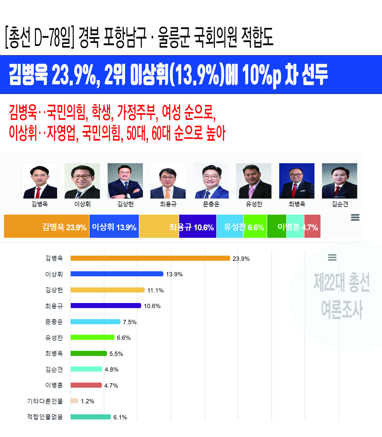 [ÃѼ± D-78ÀÏ] °æºÏ Æ÷Ç׳²±¸¡¤¿ï¸ª±º ±¹È¸ÀÇ¿ø ÀûÇÕµµ¡¤¡¤¡¤±èº´¿í 23.9%, 2À§ ÀÌ»óÈÖ(13.9%)¿¡ 10%p Â÷ ¼±µÎ