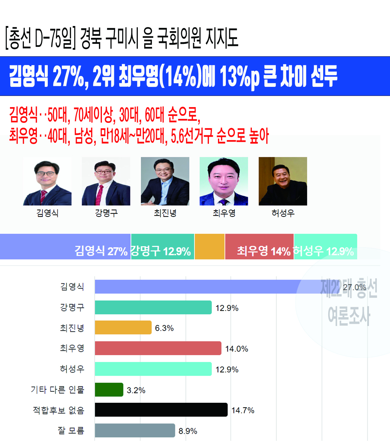 [ÃѼ± D-75ÀÏ] °æºÏ ±¸¹Ì½Ã À» ±¹È¸ÀÇ¿ø ÁöÁöµµ¡¤¡¤¡¤±è¿µ½Ä 27%, 2À§ Ãֿ쿵(14%)¿¡ 13%p Å« Â÷ÀÌ ¼±µÎ