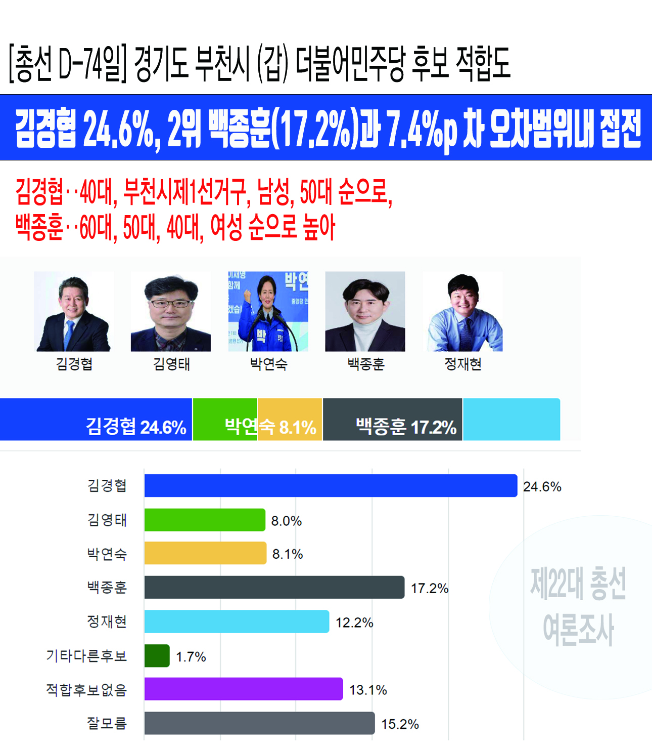 [ÃѼ± D-74ÀÏ] °æ±âµµ ºÎõ½Ã (°©) ´õºÒ¾î¹ÎÁÖ´ç Èĺ¸ ÀûÇÕµµ¡¤¡¤¡¤±è°æÇù 24.6%, 2À§ ¹éÁ¾ÈÆ(17.2%)°ú 7.4%p Â÷ ¿ÀÂ÷¹üÀ§³» Á¢Àü