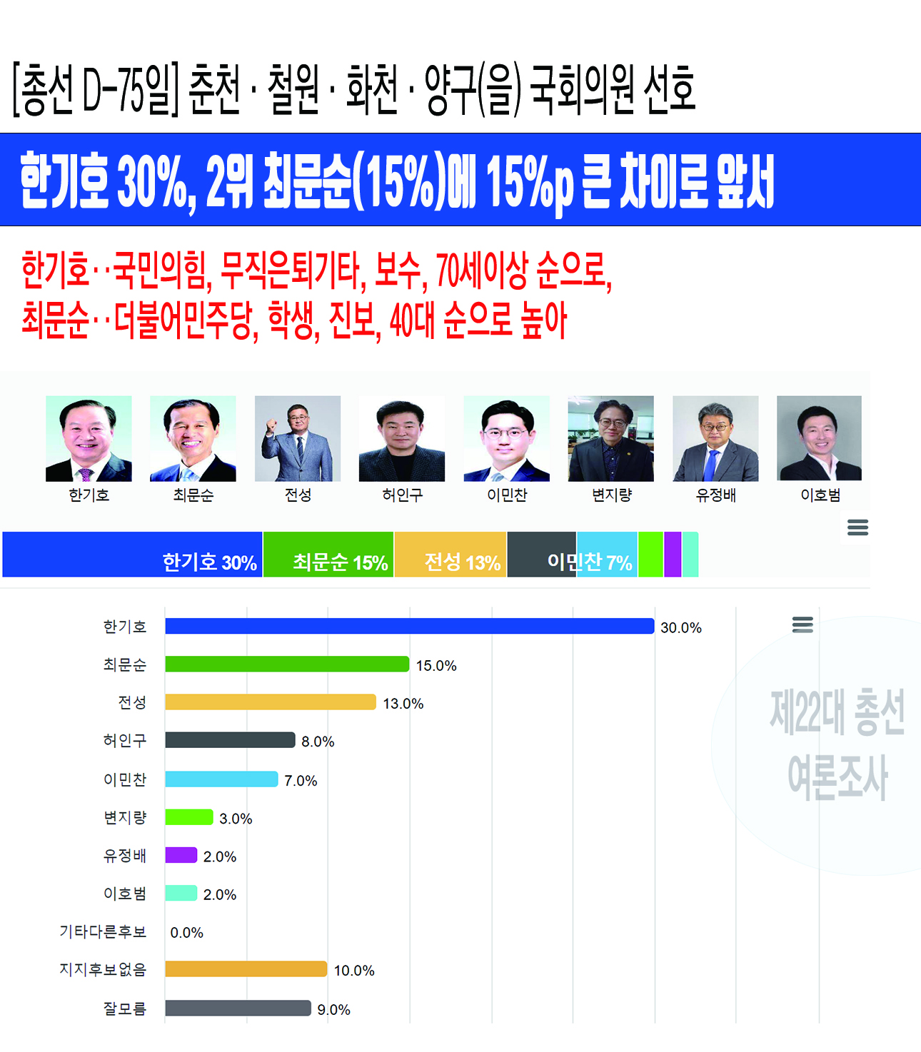 ³»³â Á¦22´ë ±¹È¸ÀÇ¿ø ¼±°Å¸¦ 75ÀÏ ¾ÕµÎ°í Á¶»çµÈ Ãáõ½Ã ö¿ø±º Èõ±º ¾ç±¸±º À» ¼±°Å±¸ ¡¸ÃѼ± Èĺ¸ ¼±È£µµ¡¹¿©·ÐÁ¶»ç¿¡¼ ÇѱâÈ£ Çö ±¹È¸ÀÇ¿øÀÌ 30%¸¦ ¾ò¾î 15%¸¦ ¾òÀº ÃÖ¹®¼ø Àü °¿øµµÁö»ç¸¦ 15%pÀÇ Å« Â÷ÀÌ·Î ¾Õ¼ ³ª°¡´Â °ÍÀ¸·Î ³ª¿Ô´Ù.
